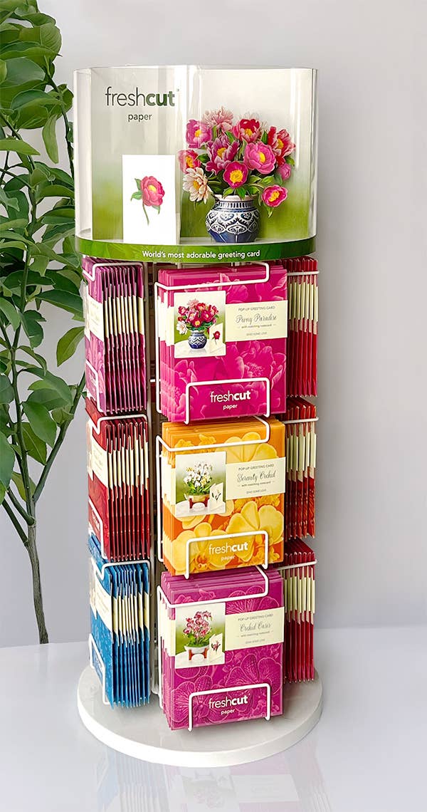 Show off the entire Birth Flower collection with the Birth Flower Corrugate floor display. It comes with full fill of product and 3 open samples. 6 cards each of 12 designs 3 free sample cards Display + signage with gold foil 72 total cards 66” H x 20.5” W x 19” D Easy to Assemble Display