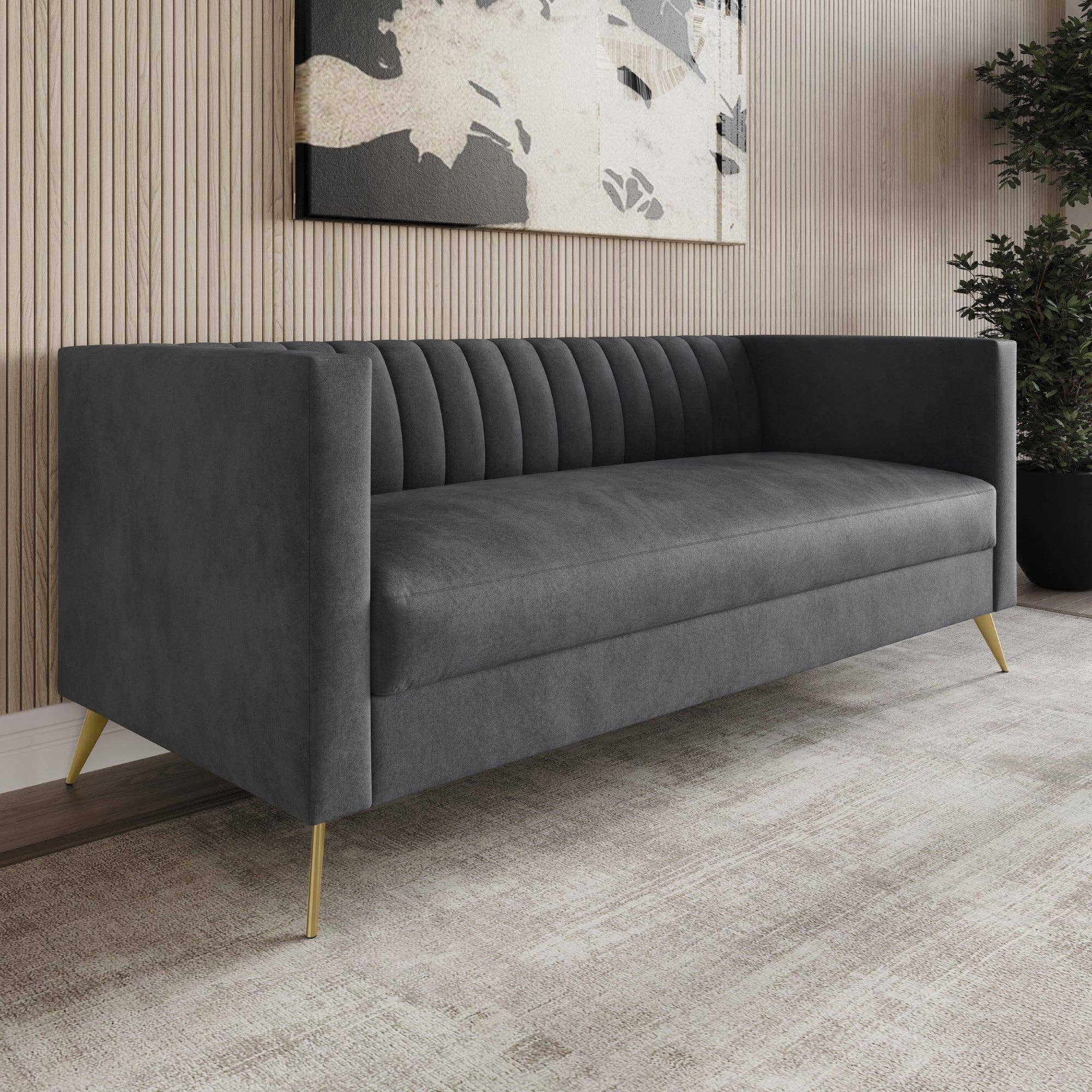 Enhance your living room with this upholstered smooth velvet three-seater sofa. Crafted with vertical channel tufting on the back, the beautiful flared arm brims have modern and classy vibes. It includes four throw pillows and sturdy gold-tone metal legs. * Vertical channel tufting on back to grab attention * Beautiful flared arm and sturdy gold-tone metal legs * It includes four throw pillow