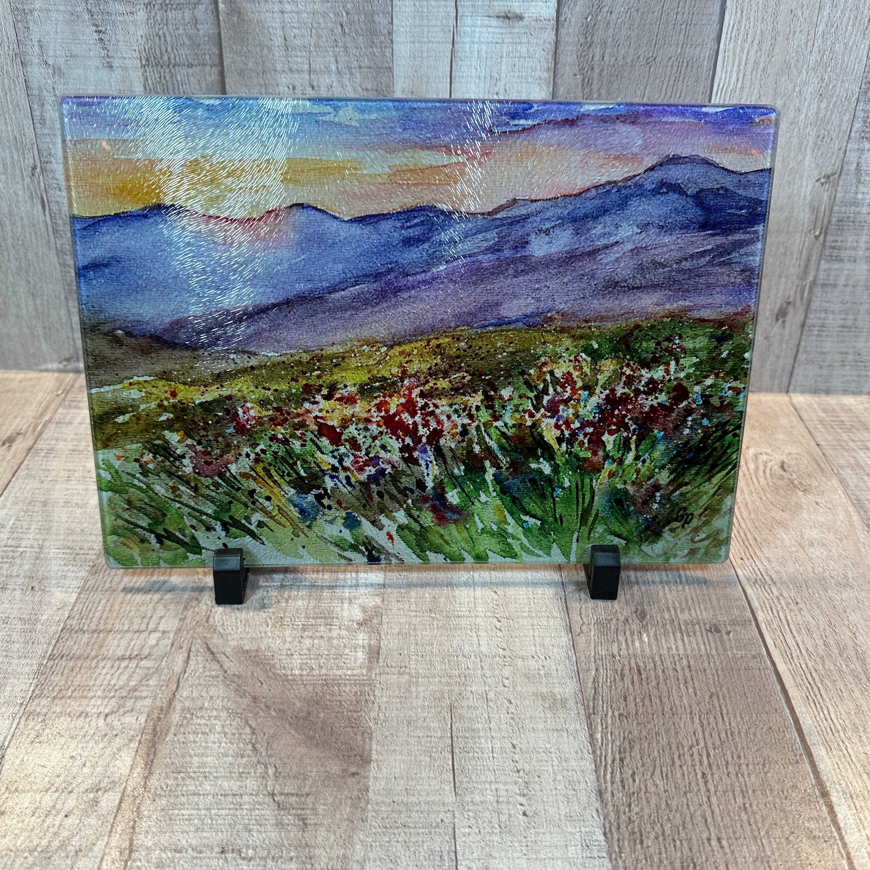 Wildflower Frenzy 4 piece hardboard coaster set with cork backing. Original painting is heat infused into glossy hardboard coaster. 3.75" x 3.75" comes in brown kraft box with window.