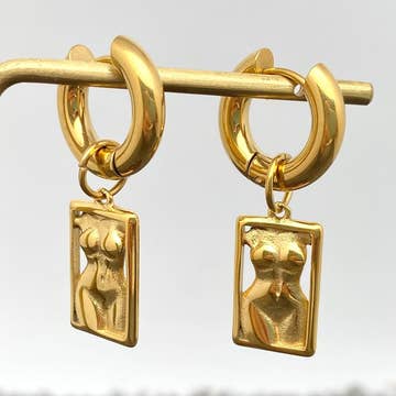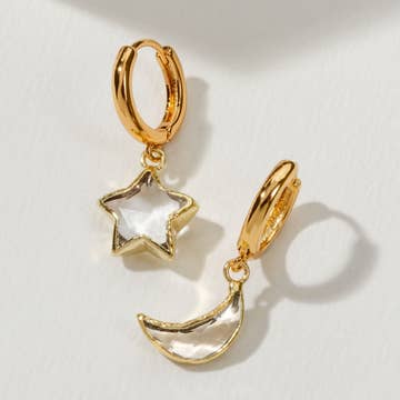 Subtley faceted crescent moon crystals dangling from 18k gold-plated one-touch close huggies. Choose from these high vibration crystals: * Rose Quartz - Unconditional love, for self & others * Aquamarine - Promotes insight & truth Make it a set by snatching The Moon Necklace. Due to the handmade nature of this item, size, shape and color of the crystal moons may vary.