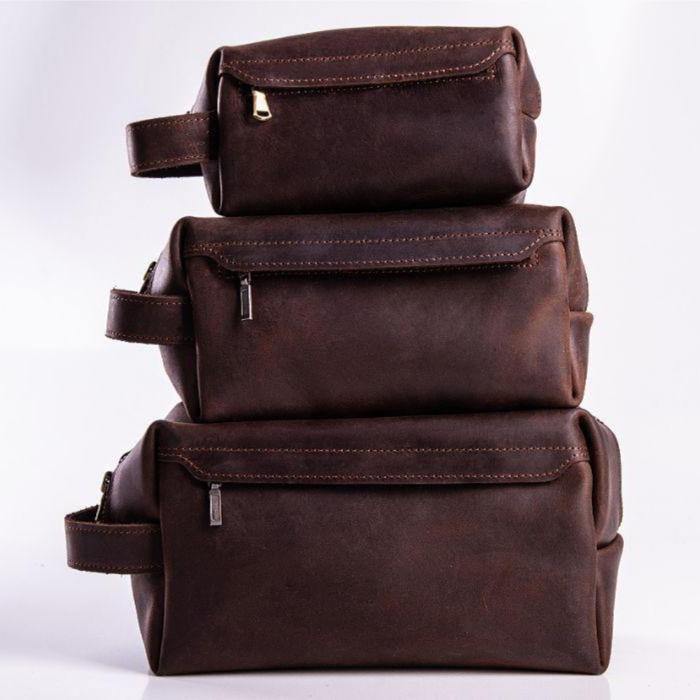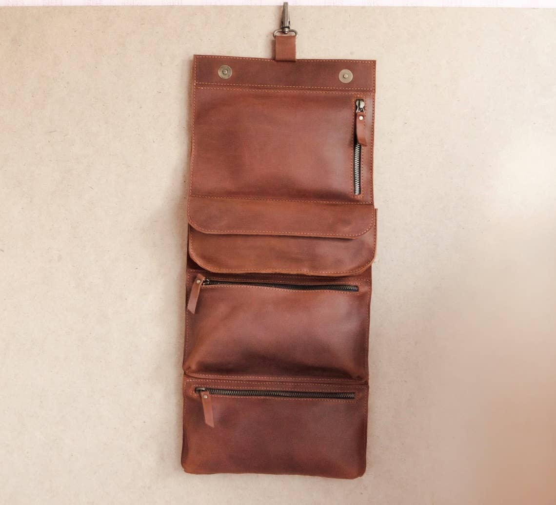 Stop over the mess with your small essentials using a leather toiletry bag. Made of waterproof durable leather the dopp kit will prevent cosmetics/makeup products from leaking on your stuff. Perfect for frequent travelers. One compartment; Zipper closure for an easy access; Side handle for comfortable use. Sizes: Medium - 16.5 x 8.8 x 7.6 cm (6.5" x 3.5" x 3"); Large - 20.3 x 10.1 x 8.8 cm (8" x 4" x 3.5"); Extra Large - 22.8 x 11.4 x 11.4 cm (9" x 4.5" x 4.5"). External zip pocket: For M - 13 x 7 cm (5.1” x 2.7”); For L - 15 x 8 cm (5.9” x 3”); For XL - 17 x 9 cm. (6.6” x 3.5”). makeup bags / make up bags / leather bags / mothers day gifts / mother’s day / valentine gifts / valentine’s day / christmas / christmas gifts / cosmetic bag / gifts for women