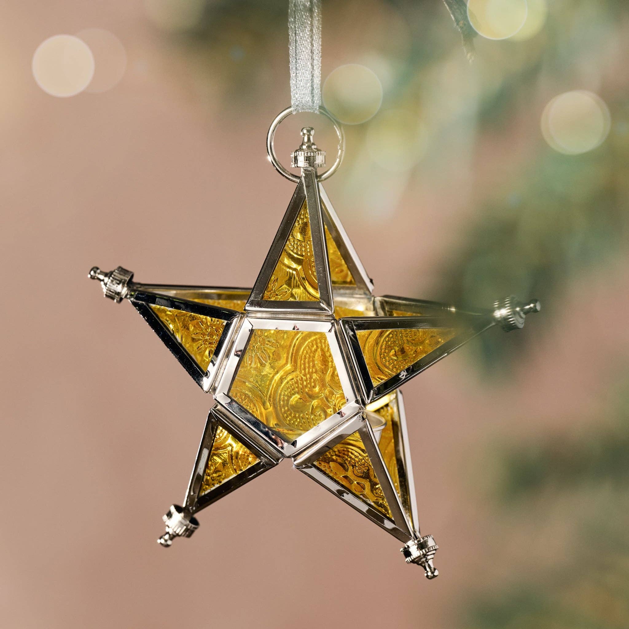 Bring a warm glow to your holiday décor with this striking ornament. Crafted from radiant red patterned glass set in silver-toned brass, this five-point, 3D hanging star is both luminous and elegant. One side opens to reveal a tea light cup that's perfect for adding the twinkle of a battery-powered only tea light. Suspended by a silver ribbon, it’s a stunning accent for windows, trees or festive displays. A shining blend of light and craftsmanship, ready to brighten the season. For use with battery-powered tea lights only. A Ten Thousand Villages Exclusive handcrafted in India. Materials: Brass, Silver Colored Plating, Glass - Measures: Overall: 4.75"W x 2"Deep; Tea Light Cup: 1.5"D x approximately .5"H, Hanger: 4"L - Colors: Red, Silver - Warnings: For use with battery operated tea lights only - Handcrafted in India