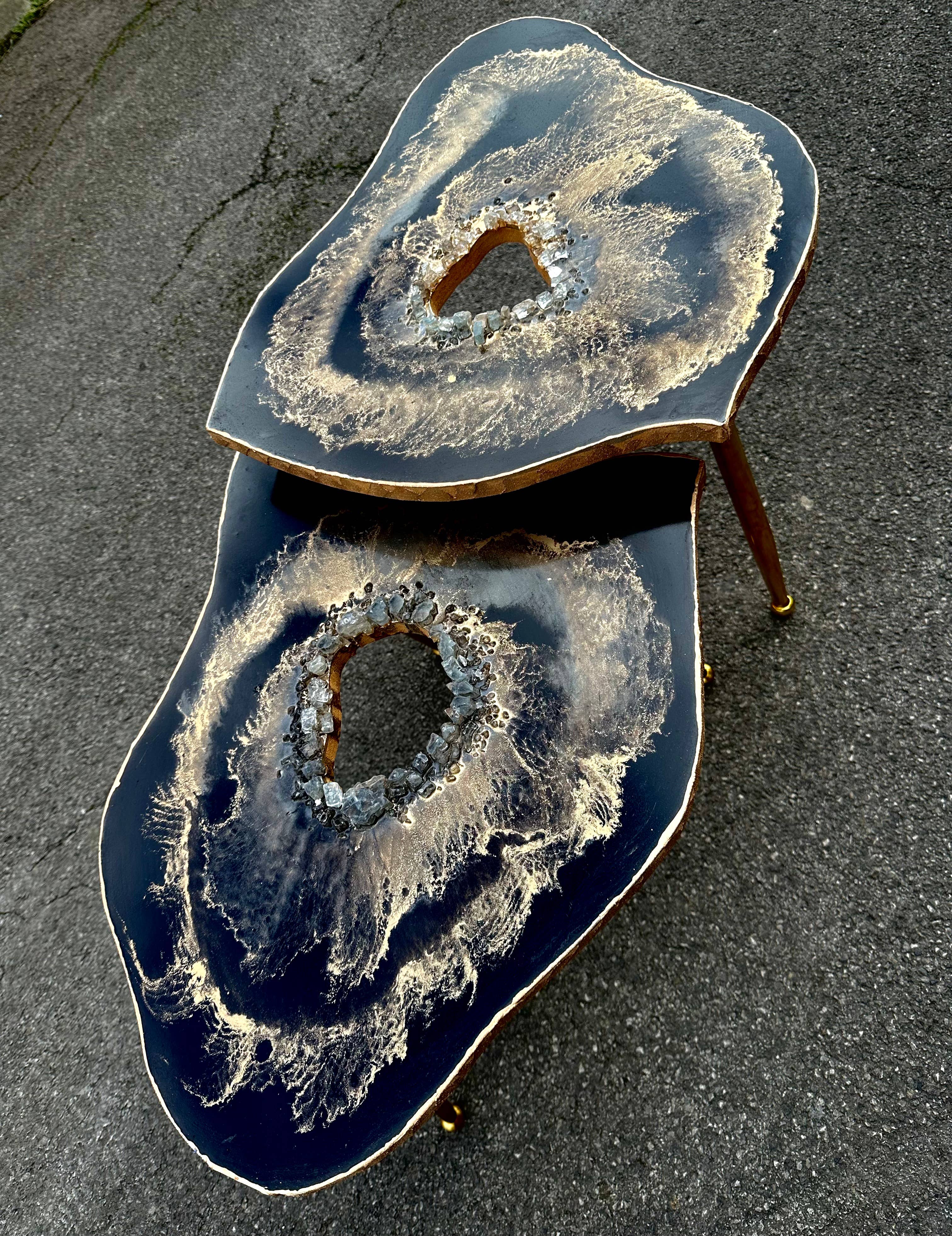 2 xLarge Original Nesting Handmade Quartz Artwork agate Gold leaf Resin art coffee table set 💎 💥(painted on wood by non-toxic Resin & shiny pigments and natural stones )💥 These agate Textured Gold leaf Painting coffee tables are bound to turn heads, made with so much love and sparkle that you can only appreciate in person! Color——🦋 black,gold SIZES -—🦋 Table _50 by50 Height - 40cm and 45cm Legs ——-🦋 Gold Metal Legs TECHNICAL INFO -— 🦋 The design is made by Resin,pigments, gold leaf and wood 💎💎 - As the art design is made by hand item patterns may differ slightly from photos, much care and attention has been paid to all items. Please be aware these are valuable handmade and art work, not made in a factory and because big this they have character. Please contact me if you would like to have the custom size and colors👩🎨 Made by - - - - - - - 🦋 -resin -gold leaf -colors -wood