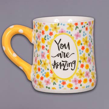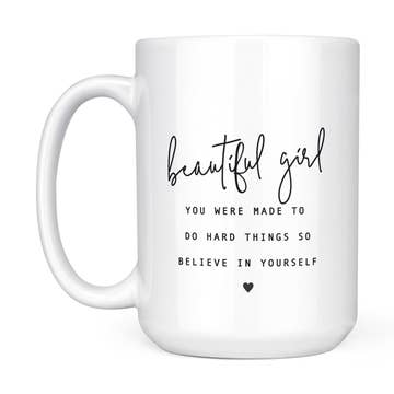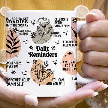 Encouragement Collection. These mugs feature self-care and encouragement sayings. The design is repeated on each side of the mug. Dishwasher and microwave safe.