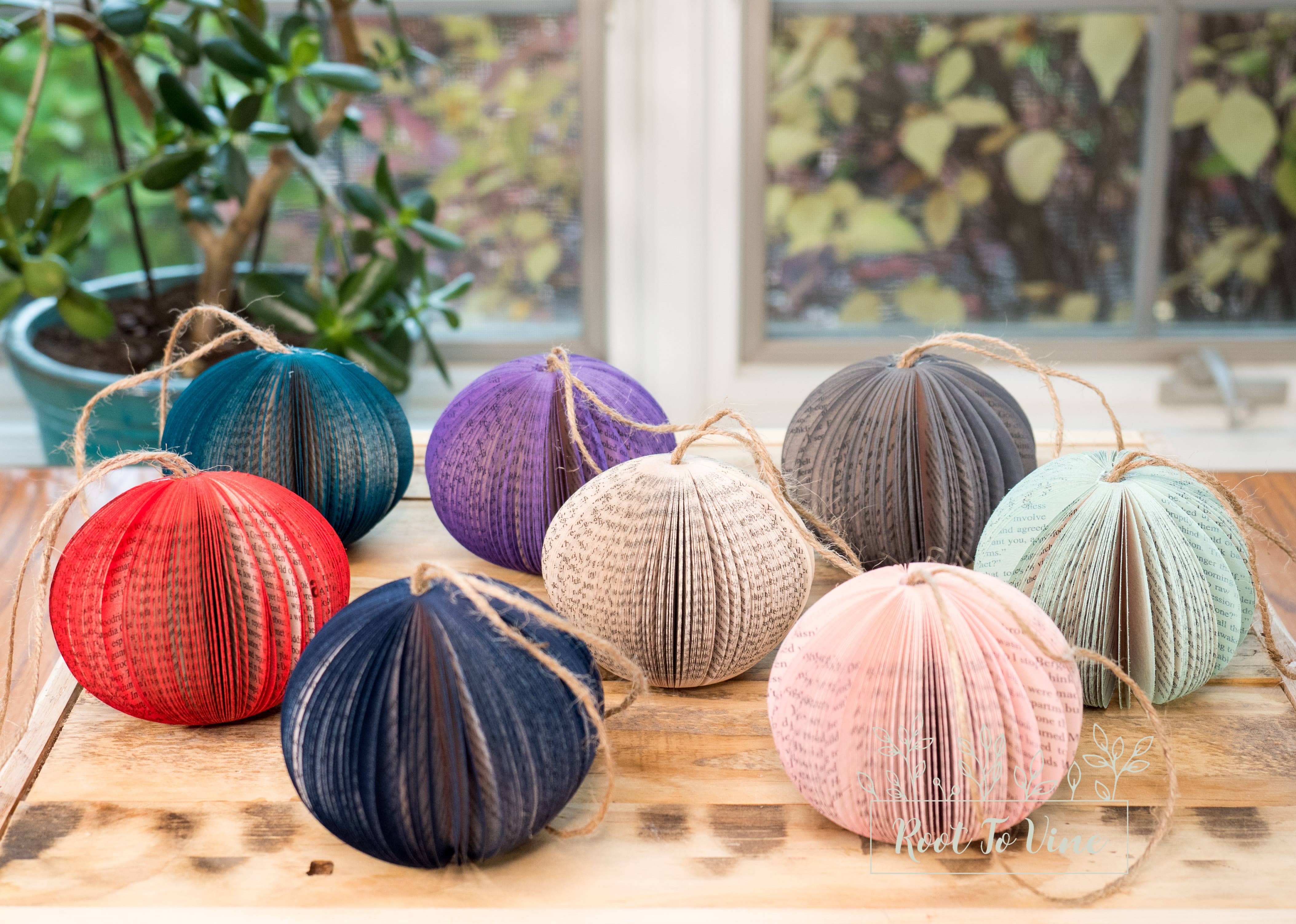 Handmade Book Christmas Ornaments are crafted from repurposed books, creating sustainable, eco-friendly holiday decor for literary lovers. Perfect as unique Christmas gifts, tree decorations, or festive mantel accents, these charming book ornaments add rustic holiday charm and cozy seasonal spirit to any home. They also make great party favors for guests and are popular with book clubs!! Each book ornament comes with twine attached to hang on your tree. Dimensions: approximately 11" around the widest part and 3 1/4" tall. Page color in ornament may slightly differ from picture.