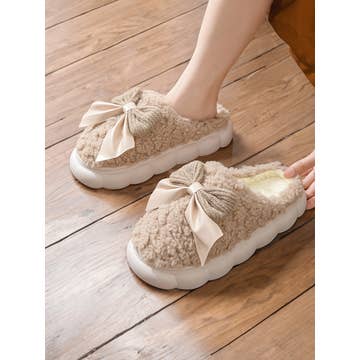 Cozy Faux Fur Lined Bow Indoor Slippers - Rubber sole - Sherpa Material - Total 6 PCS Assorted in each Pack (2 Small, 3 Medium, 1 Large) - 50% PVC, 50% Polyester **Size** S: women's size 6-7 (260 mm) 38-39 M: women's size 8-9 (270mm) 40-41 L: women's size 10-11 (280mm) 42-43 Add a sweet touch to your cozy days with these bow-accented fleece slippers. Designed in a warm tan tone with a plush sherpa lining, these slippers keep your feet snug and stylish through chilly mornings and relaxed evenings. The soft, cushioned interior provides all-day comfort, while the adorable bow on top adds a charming, feminine flair. A sturdy sole ensures easy movement around the house without sacrificing support. Whether you're gifting or treating yourself, these slippers are perfect for anyone who loves comfort with a cute twist. One size fits most.