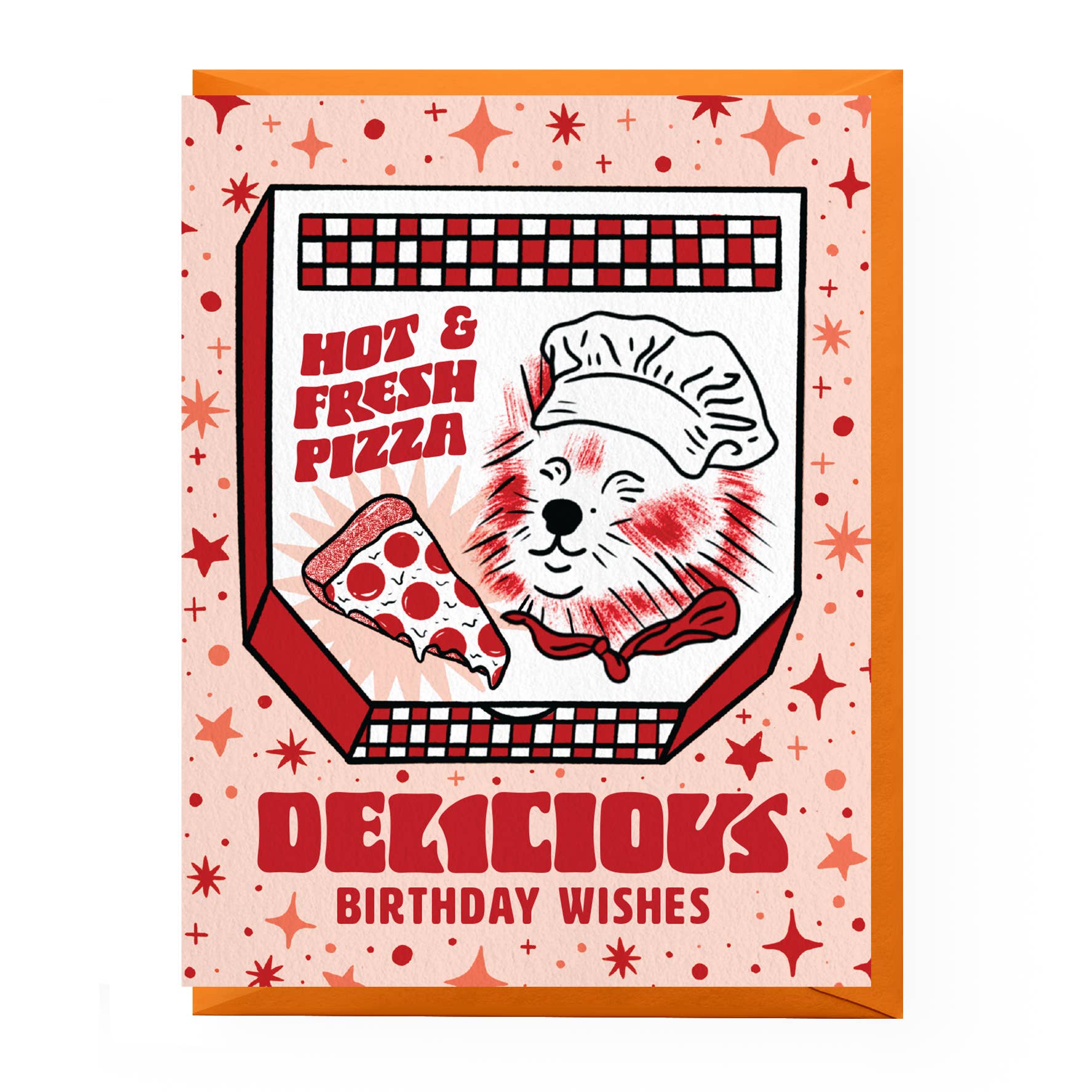 Outside: drawing of a pizza with candles. Inside: blank. Card: eco-friendly paper printed with archival ink on bright white, heavyweight paper. Size: 4.25" x 5.5". Envelope: matching, recycled. Protective sleeve.