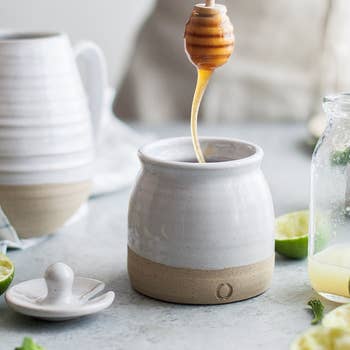 Want to leave your honey on the counter looking great? Our wheel thrown honey jar has a matching wheel thrown/ hand cut lid and comes with wooden dipper. All of our products are food, dishwasher, microwave and oven safe.
