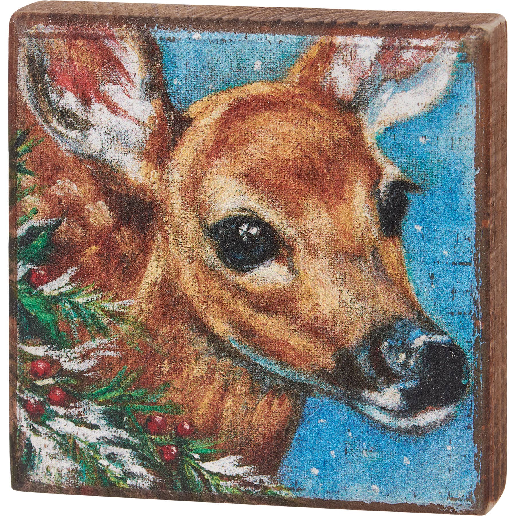 A wooden block sign from our Christmas Collection displaying a fox with snowy woodland background and natural stained wood sides. Design is replicated from original artwork painted onto burlap canvas, giving the art a unique depth and texture. Our fox block sign is easy to hang via predrilled keyhole slot or can free-stand alone.