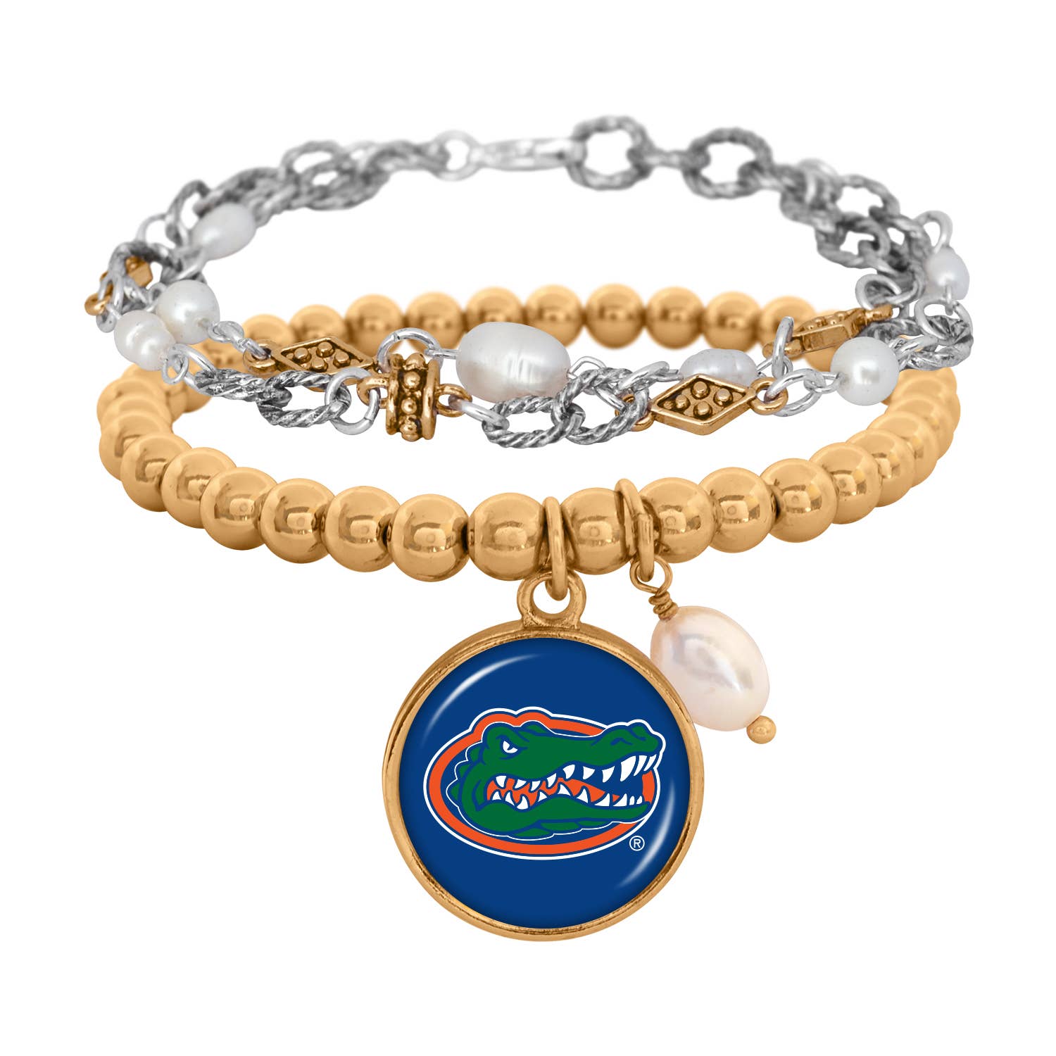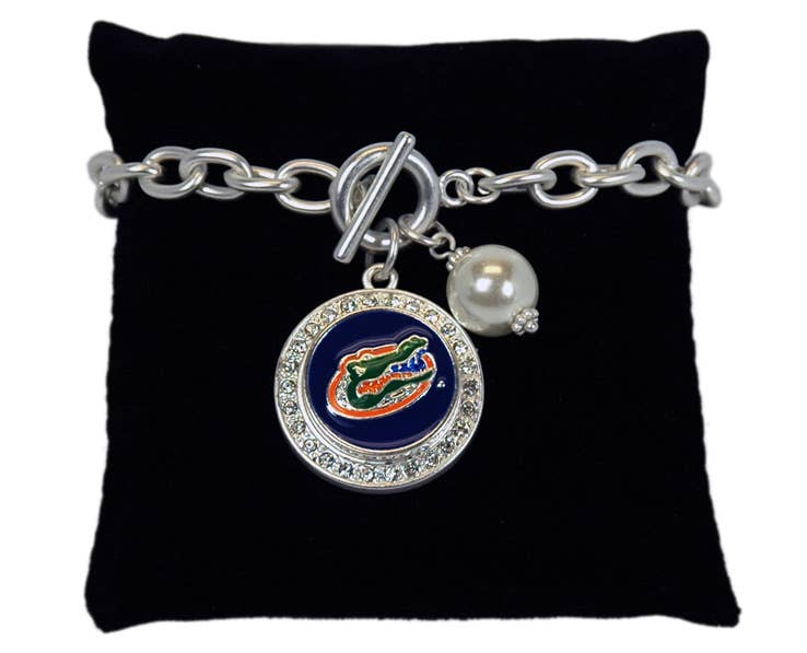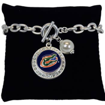 Silver plated wrap bracelet featuring light blue rhinestones, beads and enamel with imitation pearl bead accents and the “Tar Heels” slogan. This is an officially licensed product.