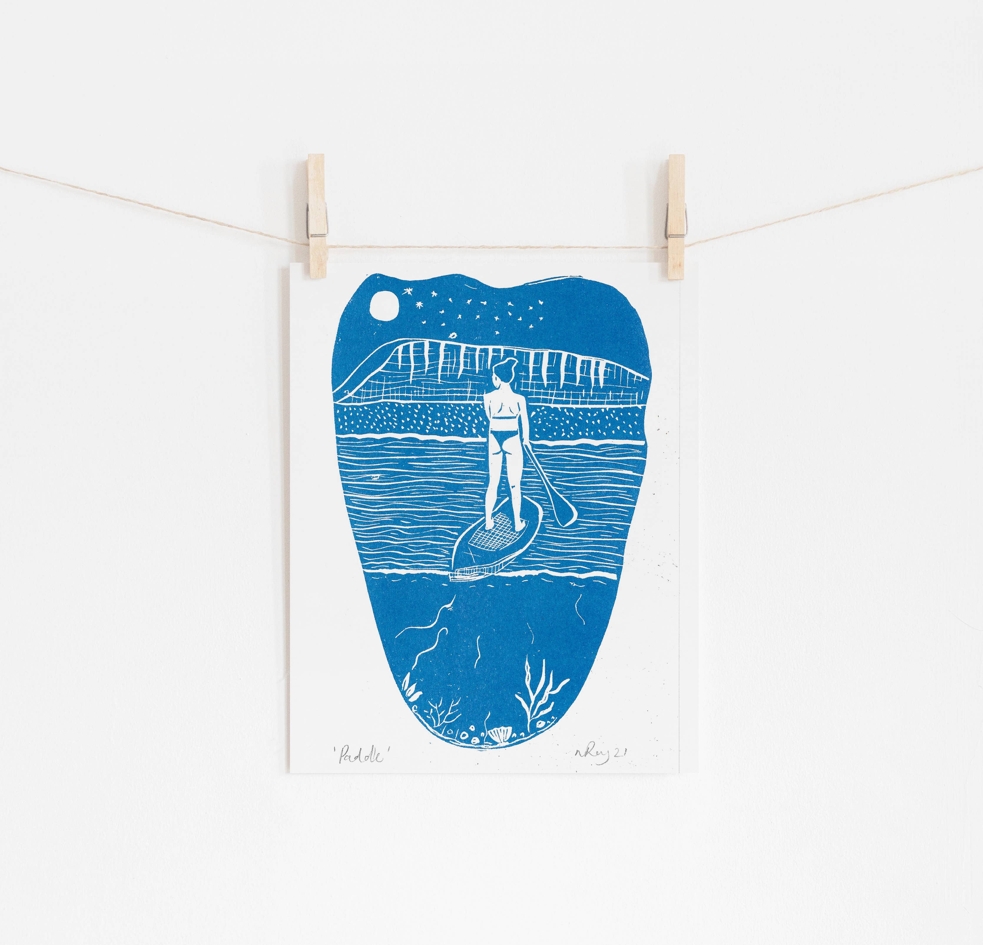 Colourful and contemporary riso graph print version of an original hand carved linoprint of the same name. A3 size, printed onto thick Tree Free creamy paper stock. Mount backed, recyclable opp cellophane wrap and brand sticker