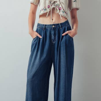 SKU: CJ8C2537M1-48B Made in China Aesthetic: Casual and Retro / vintage Care Instructions: Machine wash Color: Blue Denim Wash: Medium Wash Fit: Contemporary and Petite Occasion Theme: Everyday Occasion: Night Out and Work Pant Length: Ankle Pant Style: Cropped and Wide Leg Rise Style: High Season: Spring/Summer Fabric: "Vintage Denim 56% Cotton, 24% Rayon, 19% Polyester, 1% Spandex" Weight: 0.54 kg (1.2 lb)