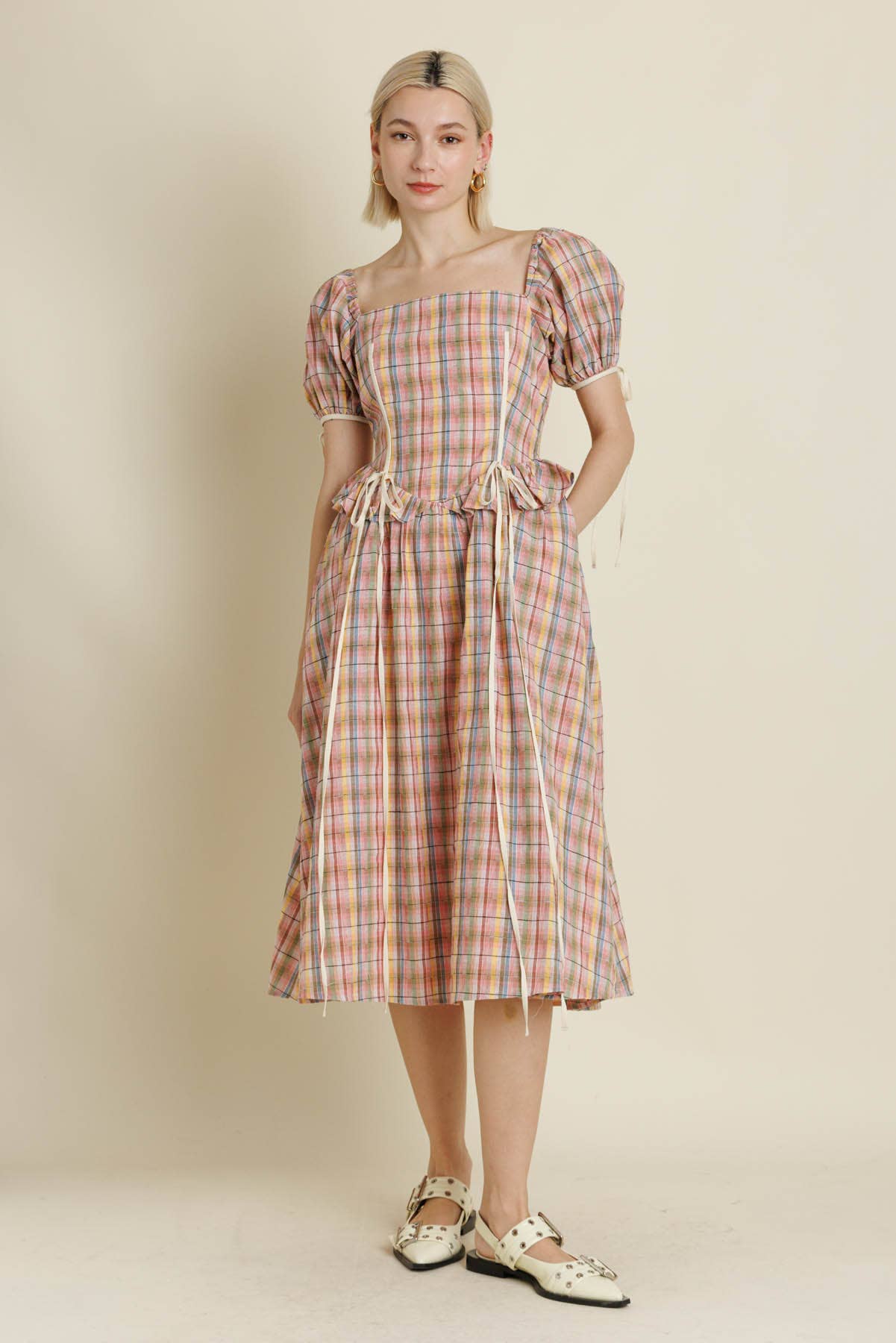 -Fabrication: Non-stretch cotton poplin -Shirred bodice with adjustable tie -Side seam floating pockets -Fully pockets Model is 5'9" and is wearing a size Small