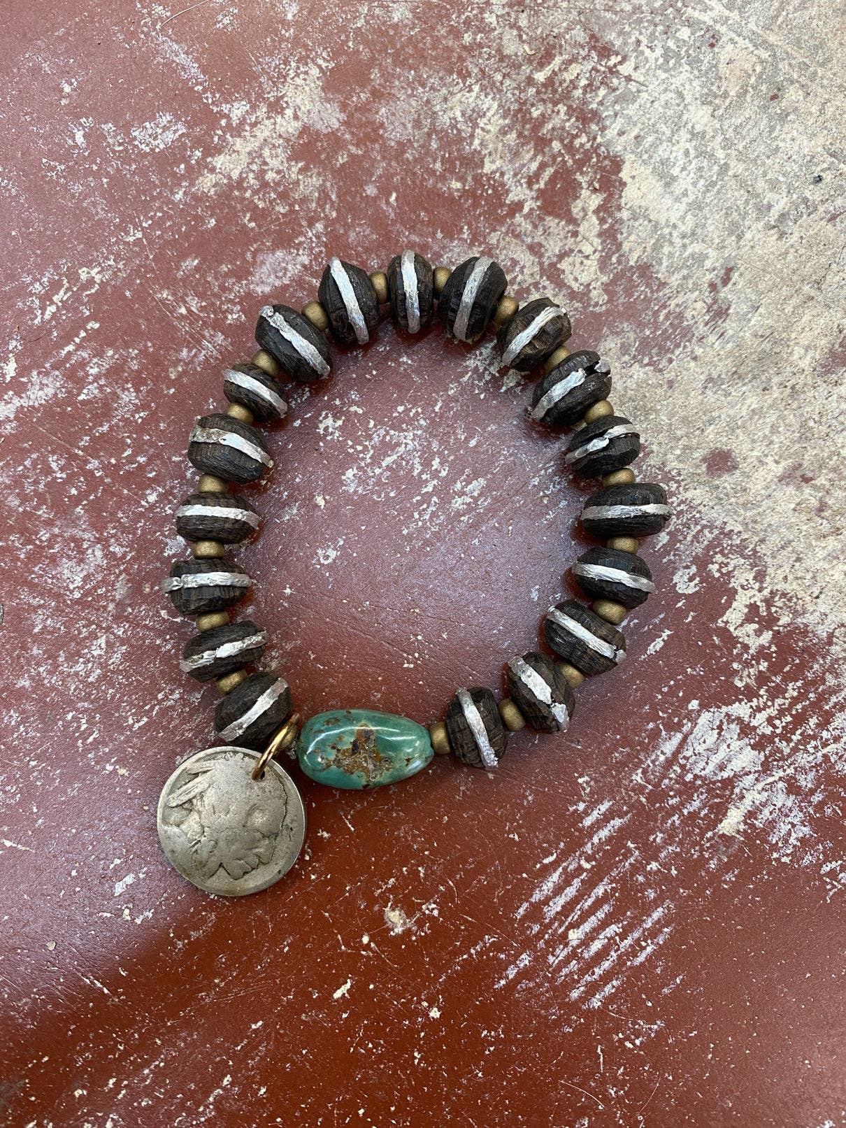 Cool dudes wear beads. Turquoise, robles wood, Ethiopian silver, brown elastic cord, approx. 8.5”. Given the uniqueness of small batch components and availability of gemstones, some variation may occur and will be as close as possible to what is pictured.