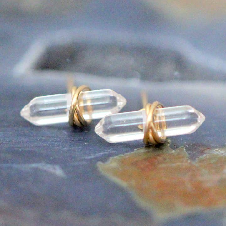 Every girl needs a gorgeous pair of everyday studs and these fit the bill perfectly. Genuine Peridot has been custom cut into gorgeous linear double pointed bars and wire wrapped in my original bezel-like style with your choice of semi-precious wire to create a gorgeous pair of stylish studs with just a little edge. Available in 14k Gold Filled, 14k Rose Gold, Sterling Silver Peridot: 14mm Modeled photo shows the same earrings in Green Aventurine for size reference.