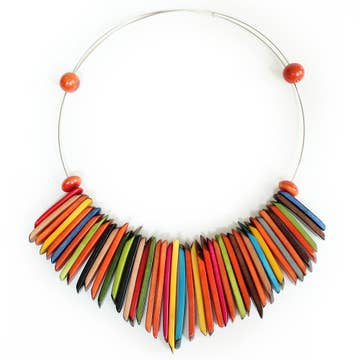 A fringe of rectangular Tagua beads wrapped around a steel memory wire. Each rectangular bead was shaped from vegetable ivory (Tagua seed) and dyed (A little bit of the seed's skin is visible on the tips). Two Acai seeds finish it off at the back tips on each end. All the beads used are sustainable, organic, vegan and biodegradable. This tagua necklace is fair trade and ethically handmade in Colombia, Muichic Natural Jewelry is a proud member of the Fair Trade Federation. When ripe, tagua seeds are harvested and dried for 6 to 9 months. After losing all their moisture they become rock solid resembling ivory in color, texture and hardness, hence their nickname: “Vegetable Ivory”. At this point the hard seeds can be polished, dyed, cut and shaped into beautiful beads that become Muichic’s natural jewelry.