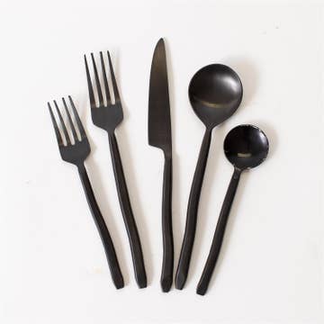 Hand forged in Moradabad, a city in India known for metal craftsmanship, our Tides Flatware is a testament to timeless quality. Hand-forged from stainless steel, it boasts a distinctive distressed matte black finish that proudly bears the authentic marks of their skilled makers. With an effortless look for everyday tablescapes, it also adds timeless luxe when dressed up for special occasions. Each place setting is sold and packaged individually to give you the flexibility to buy the exact number to suit your entertaining needs. Each box includes a dinner knife, dinner fork, dinner spoon, salad fork and teaspoon ranging in size from 7.25" to 9.5". Hand wash recommended.