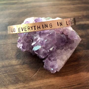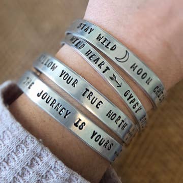 Celebrate passion and purpose with this "Get Lost in What You Love" aluminum cuff bracelet. Each piece is hand stamped one character at a time, giving it a raw and authentic finish. Made from hypoallergenic, non-tarnishing aluminum, this 1/4" wide bracelet is adjustable for a comfortable fit. A beautiful reminder for creatives, dreamers, and doers.