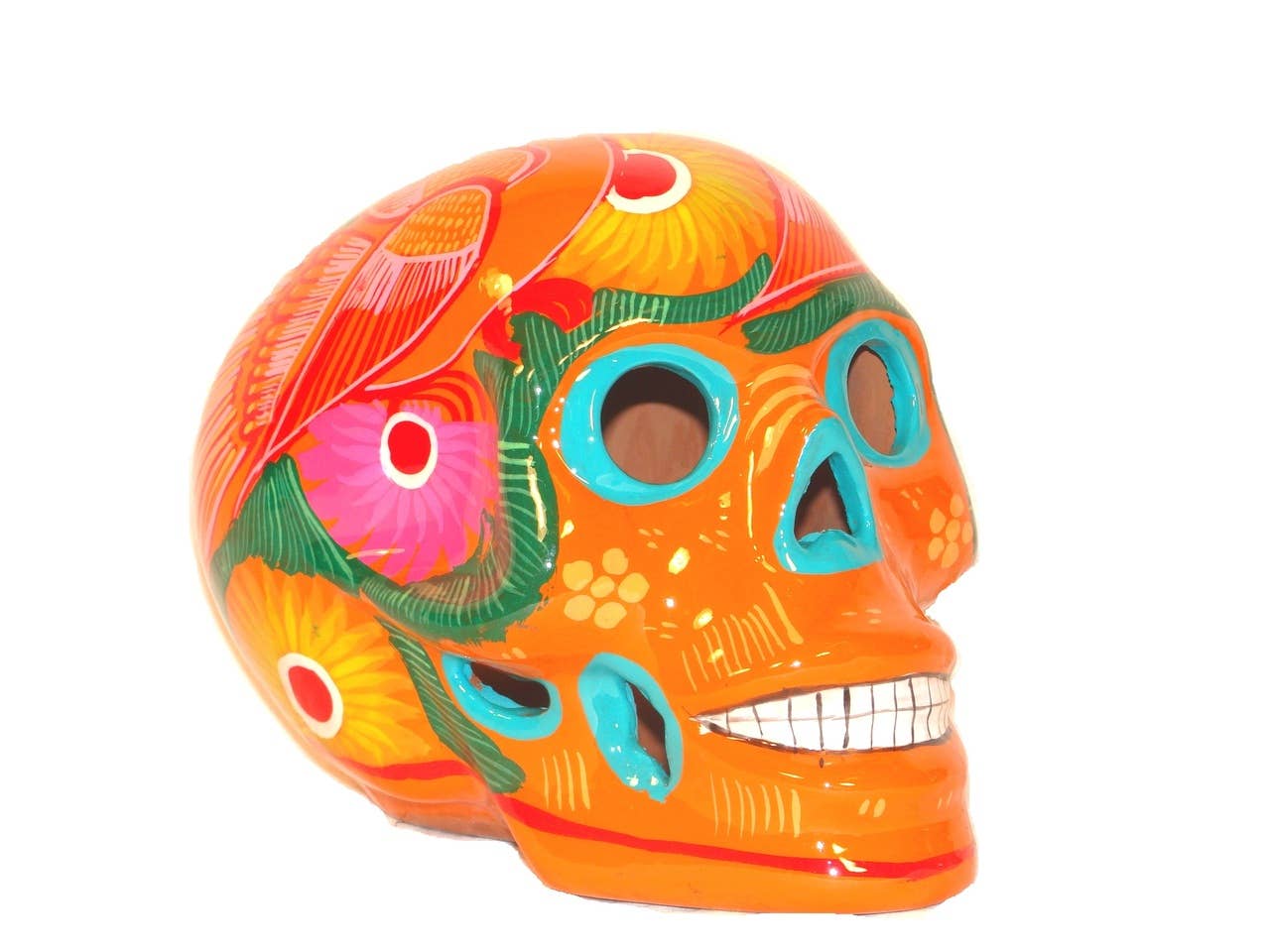 Sugar skull small double fired ceramic 4.5" X 4.5" Mexico folk art day of the dead. This eye-catching skull will certainly liven up your living area!  It's hand-painted in vivid colors and has a glossy finish. It's fully painted and glazed, but is not frost-resistant--so it needs to live inside. This beautiful hand-painted ceramic sugar skull was handcrafted in mexico. Each skull is brilliantly and uniquely painted in a variety of colors. These skulls are traditionally used in the celebration of the day of the dead (dia de los muertos) in mexico. 4.5" X 4.5" Small sugar skull (large apple size) one of a kind, not two alike. Assorted colors we ship random pieces from our current inventory (not 2 alike) images are examples of skulls available, we ship a random piece from current inventory.