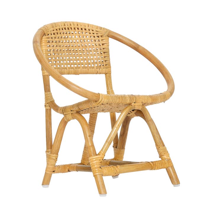 • Made with Rattan and Cane • S: 18″ x 16″ x 8″ • L: 23″ x 22″ x 13″ • Sold Individually • Handcrafted in India Add a touch of natural beauty to your child's space with this natural rattan chair. This handmade kids chair is crafted with care and attention to detail and designed to withstand the active lifestyle of children. Handmade from high-quality rattan by artisans in India, it guarantees durability and longevity, ensuring you can use it for years to come. Ideal for your child's playroom, bedroom, or any space in your house.
