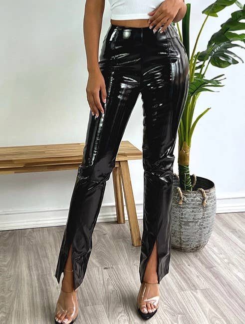 Elevate Your Style with Stretch Vegan Leather Pants Chic, stretchy, and cruelty-free, these vegan leather pants are the perfect blend of style and comfort. Featuring a trendy front split, they pair effortlessly with flats, booties, high heels, or casual sneakers. Style it Your Way: Ideal for the office, parties, date nights, clubs, or daily wear. Add a short jacket—denim or otherwise—and let your individuality shine. Comfort Meets Fashion: Designed with high-quality stretch vegan leather for ease of movement and lasting comfort. Functional Details: Zip fly with button closure, faux front pockets, and back patch pockets combine style with practicality. Model Details Wearing size Small Height: 5'6" | Waist: 26" Size Small Measurements Inseam: 31" Front Rise: 11.5" Back Rise: 13.5" Waist: 12.5" Make a statement wherever you go—no rules, just your unique flair!