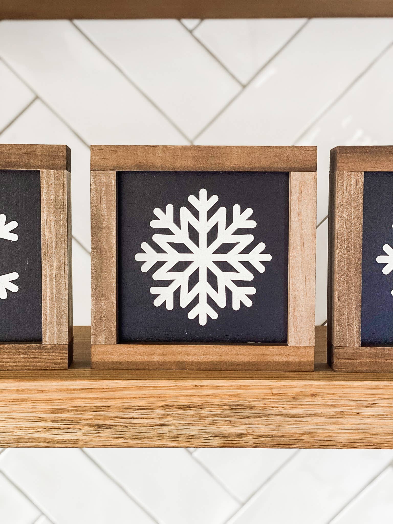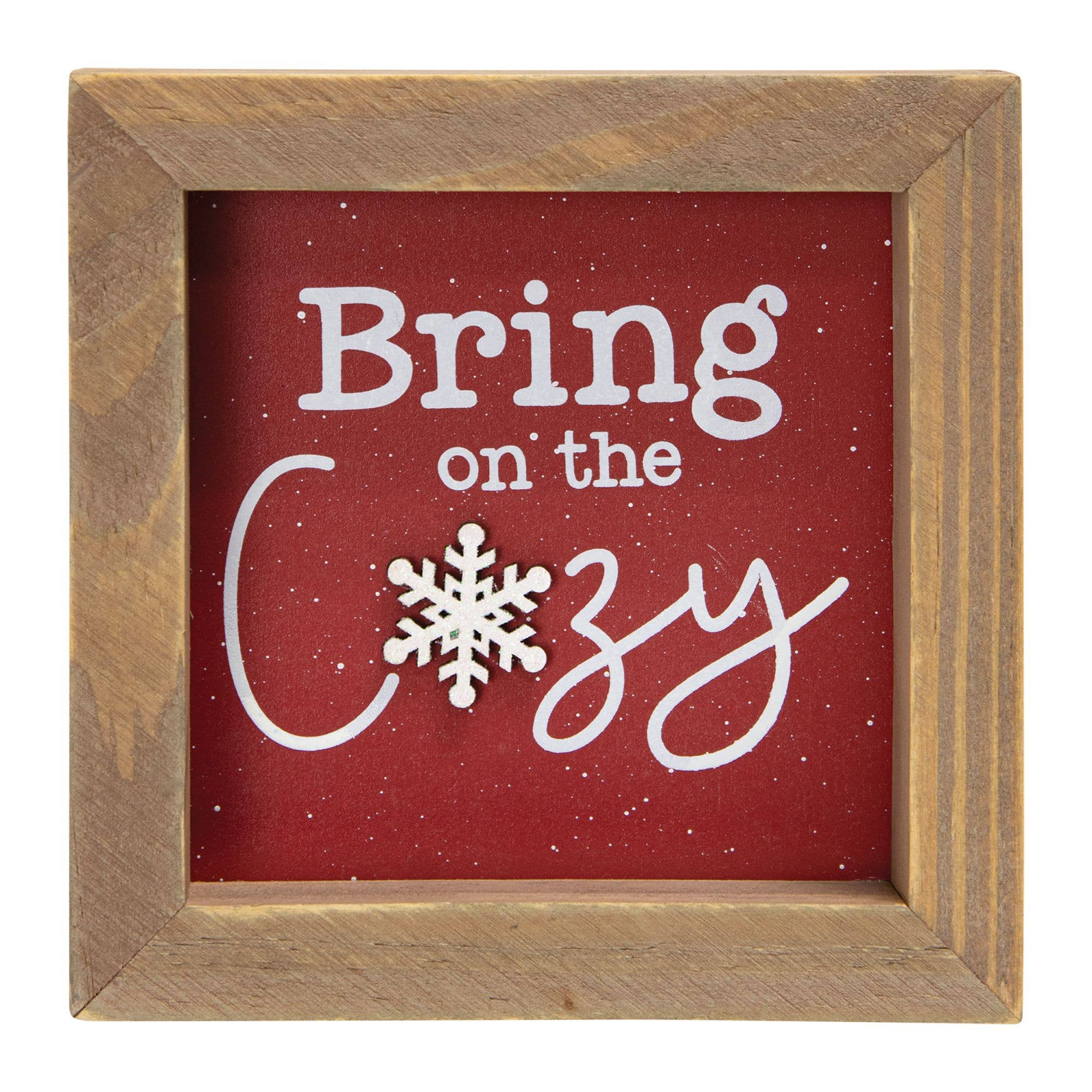 Cuddle into the Winter farmhouse this season with the Snuggle Weather Chunky Snowflake Sitter. This solid wood snowflake sitter is white with distressed edges and reads 'Snuggle Weather' in black script. It has glitter accents at the edges and a smaller, more intricate snowflake cutout that is covered in glitter. The sitter measures 8" high by 9" wide by 1" deep and is freestanding. This snowflake looks lovely with black or blue Winter decor or paired with sweater-patterned items.