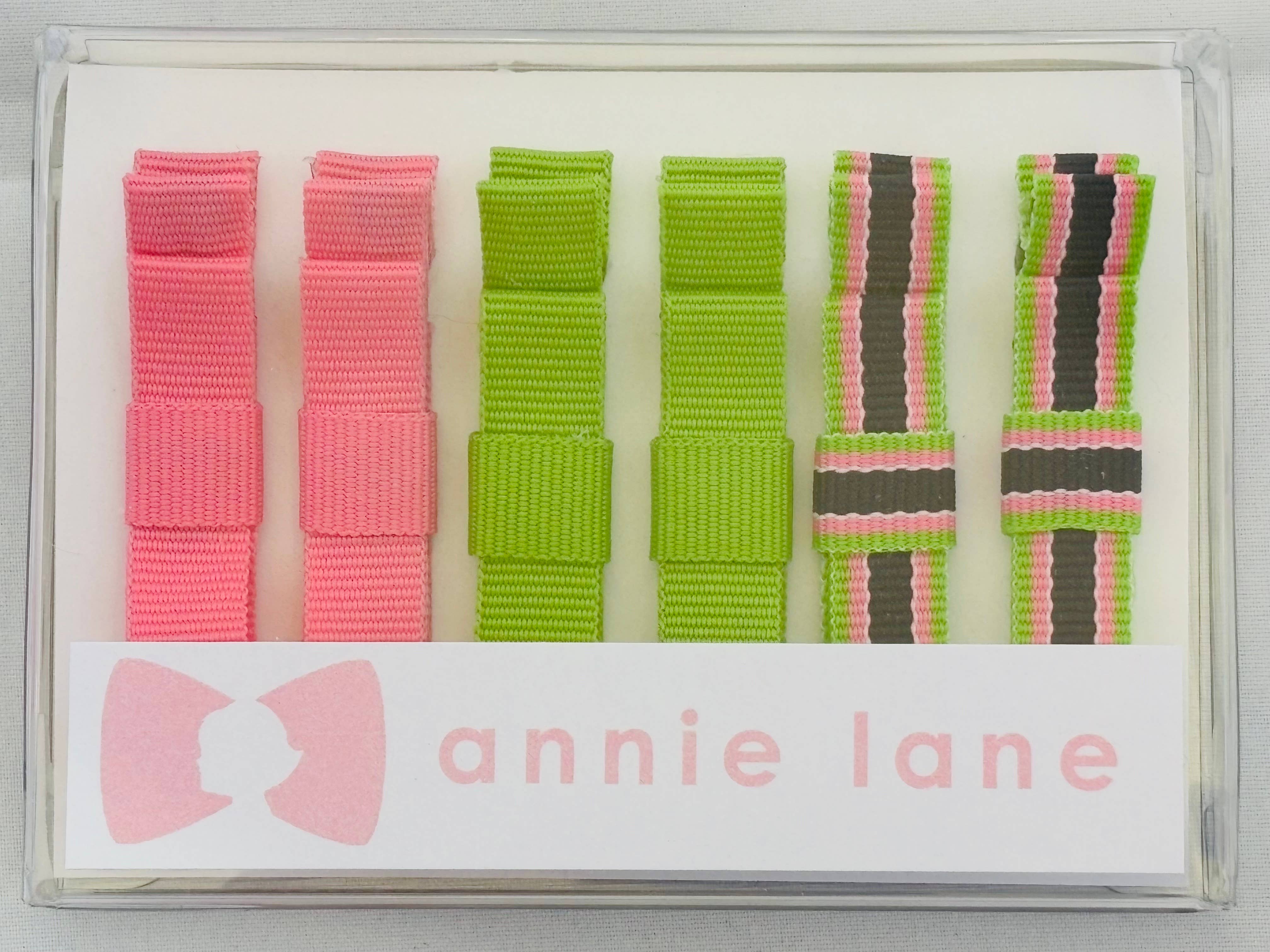 This sturdy bow measures 1.75". Perfect for little ones who need their hair pulled back or older children who like a small clip and a little color in their hair. The box includes 6 bows. The suggested retail price is $18.00. The metal clips we use are steel and strong, with great tension. They are tested in a US laboratory and are CPSIA compliant.