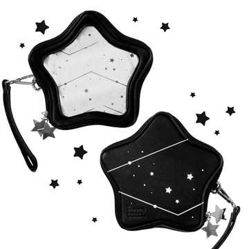 Carry your enamel pins with you everywhere! This super cute bag is made of PU vegan leather, has a main pocket to store your card wallet and keys, with an extra card pocket inside. (It's a small wristlet to carry only a few things!) The second pocket has the clear window, with a removable section to switch between your pin displays. PU vegan leather with polyester lining. Clear vinyl window to display your enamel pins! Screen-printed constellation design. Stamped with logo on back. Removable and interchangeable pin holder, attached with velcro. Custom inner lining print. Size: 7"x7"x2" 5.5" wristlet strap.