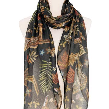 Charcoal grey bamboo scarf with hand-printed gold tropical leaves pattern. This is a super-soft and comfy charcoal-grey scarf, made from eco-friendly bamboo-cotton blend fabric, hand-silkscreened with my original hand-painted tropical leaves pattern design in metallic gold ink. Scarf measures approx. 56" x 18", long enough to wrap around the neck twice, or tie in a dozen different beautiful styles. Scarf edges are raw, unhemmed, fabric will curl at the edges.