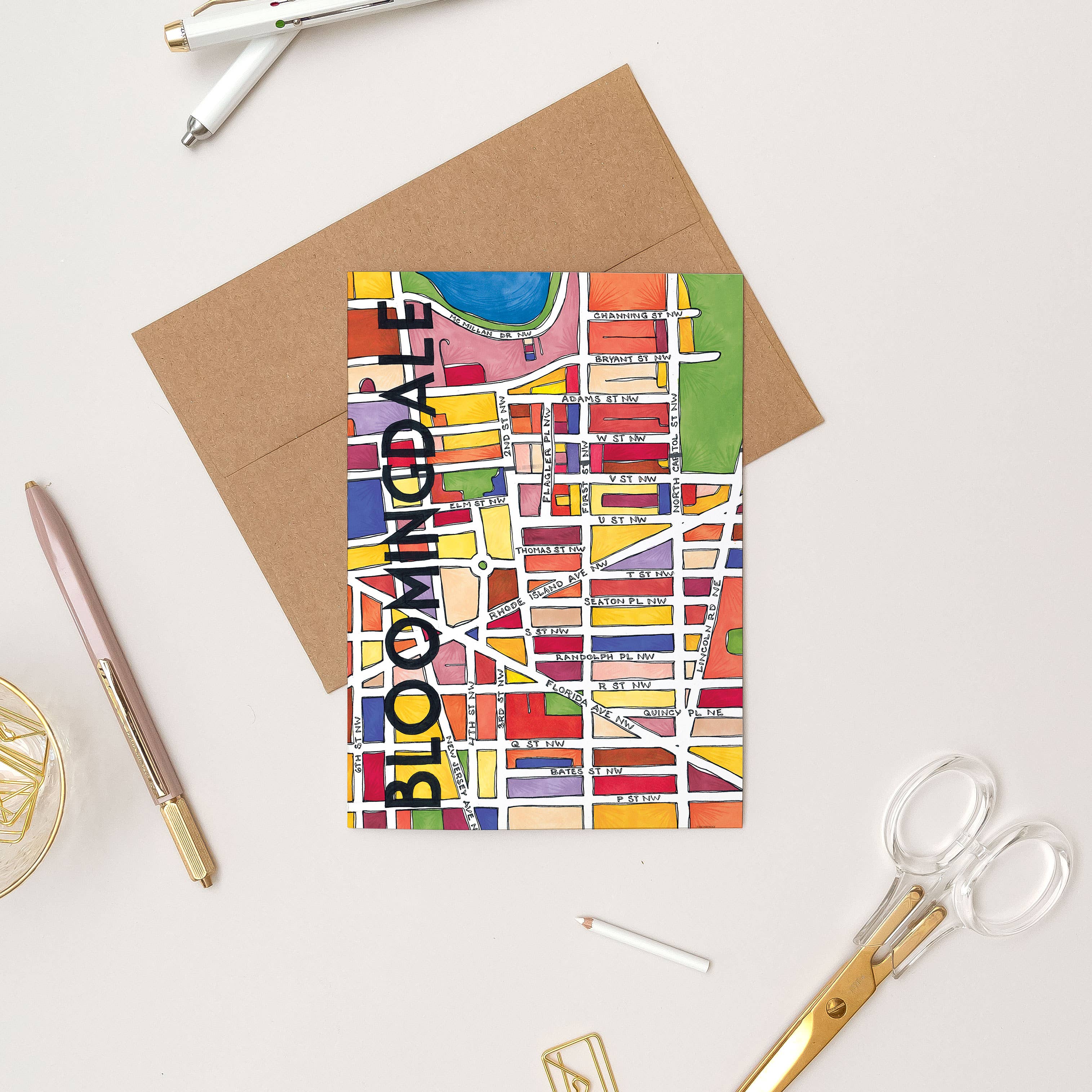 Meet the LeDroit Park, DC Neighborhood Map greeting card! Our greeting cards are 5x7” so they can be mailed or easily framed as a mini-print. Each greeting card is packaged in a crystal clear poly sleeve with a kraft paper envelope. This hand-illustrated map includes all the streets in the neighborhood, as well as local parks in a vibrant green. We’re excited to help you celebrate all the places you call home with this colorful map greeting card! As part of our commitment to the planet, our maps are printed in EcoSilk paper using soy-based inks for minimal environmental impact. Our maps are locally printed in Washington, DC with vibrant, saturated colors, and high quality papers and inks to make sure the colors won’t fade over time.