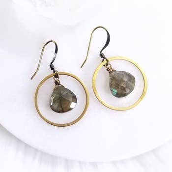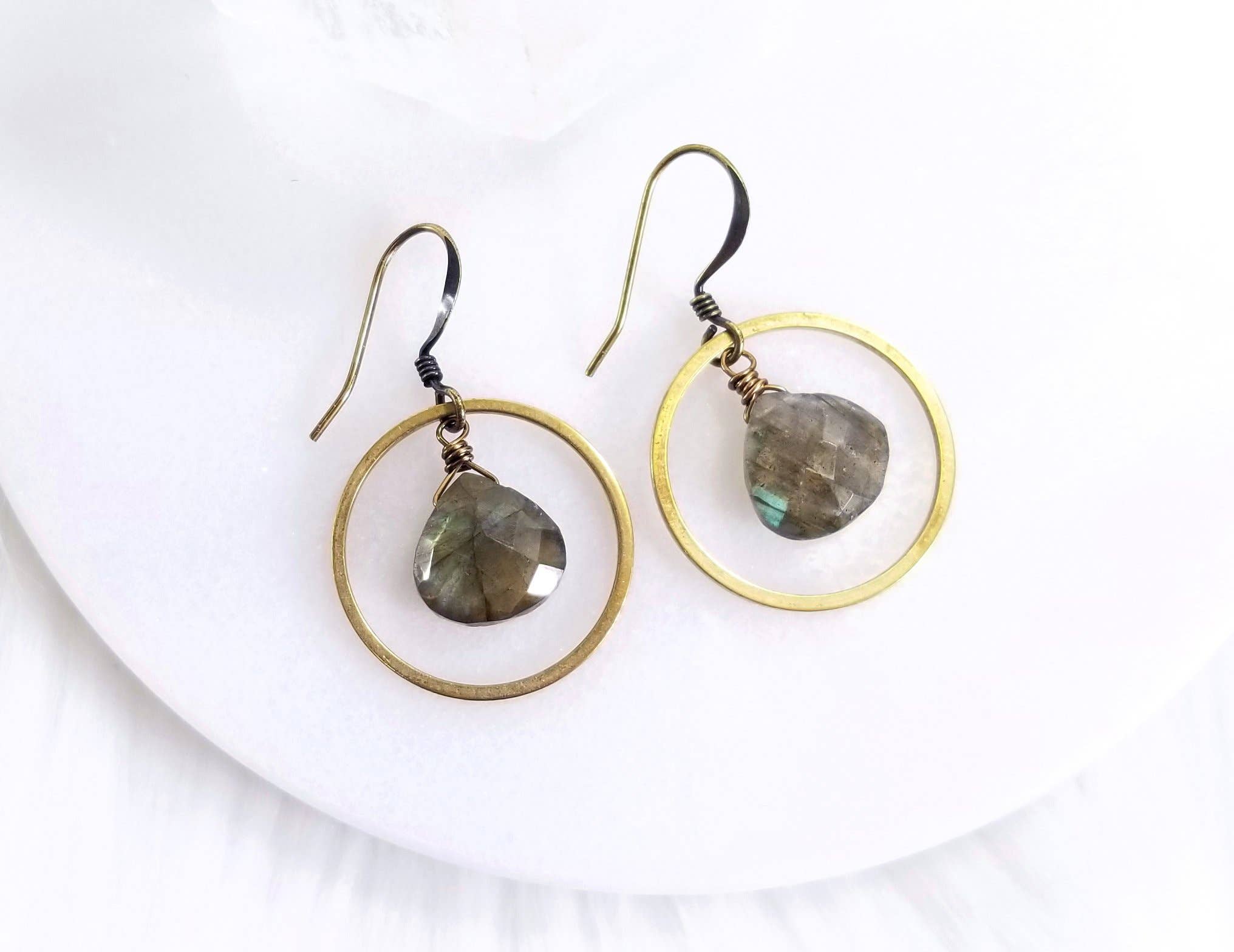Celestially inspired statement earrings for a bold, yet lightweight statement. The earrings in this collection are made with a mixture of metallics; all are raw brass, or are raw brass plated with silver or oxidized black brass. This exact pair of earrings has these specifics: *stainless steel ear wires *faceted black spinel briolettes wrapped with sterling silver wire *3 1/4" long *very lightweight