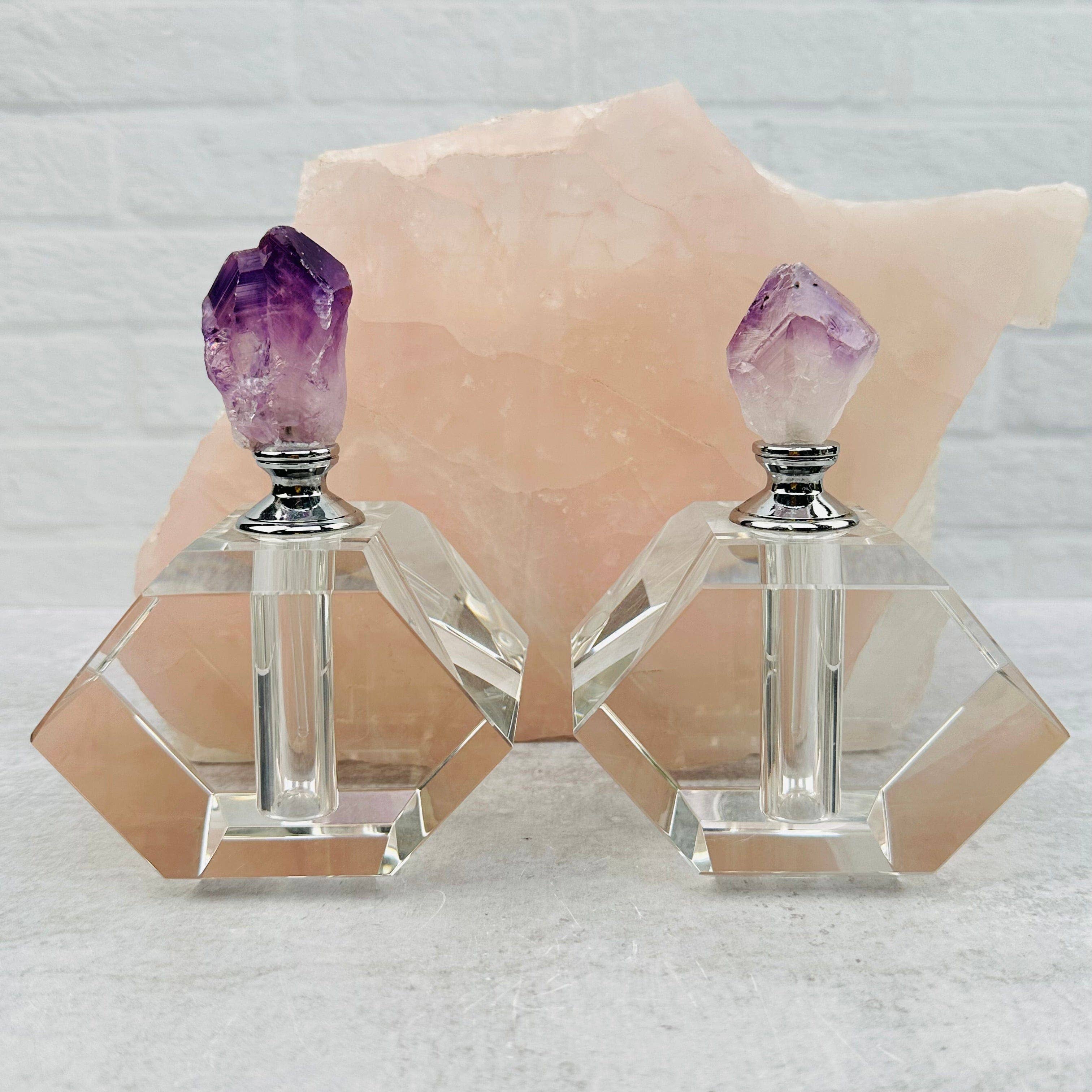 This listing is for this one (1) Small Perfume Bottle with a Stone Dispenser. STOCK PHOTOS - The stones on these will vary in characteristics due to them being natural. STONES AVAILABLE ARE: Amethyst Seer Stone, Rose Quartz Seer Stone, and Crystal Quartz. Stone measurements range from approx.:1.25" x 1.50" x 1.25" - 2" x 1.75" x 1.25" Bottle itself measures: 2.50" x 1.25" x 1.25" weighs: .210 kg You can select your desired stone by using the option menu. Thank you and have an amazing day.