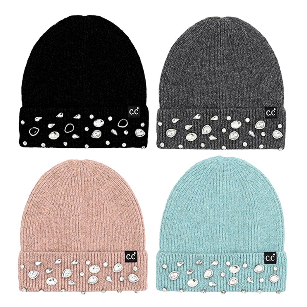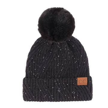 Glitter Sequined Cuff Beanie with Pom Pom - Glitter Sequin Bejeweled Design - Solid Colored Cuff Style Beanie - 100% Faux Fur Pom Pom Attached - 100% Polyester **One Size Fits Most (9.5" W x 9" H)**
