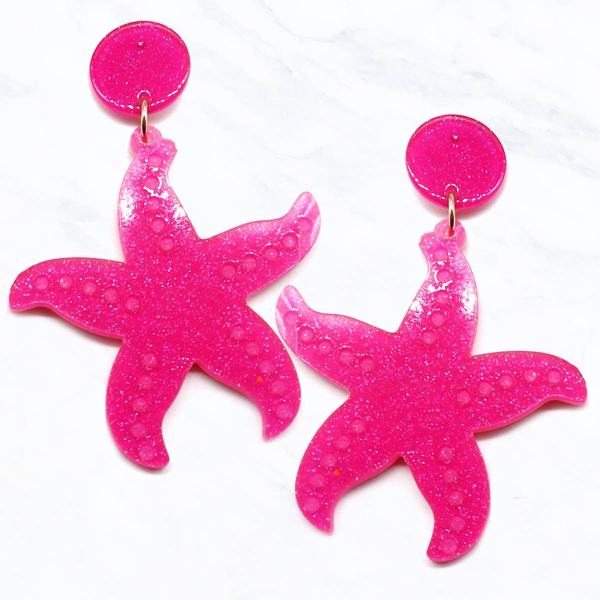 These glittery starfish & shell dangle earrings are not only a fun statement, but they're also lightweight and durable, so you can wear them comfortably all day long. The design is hand-drawn by an artist and each pair is handmade with love from plastic and coated in resin. These earrings are a must-have for ocean lovers, marine biologists, beach enthusiasts and more. Each pair comes packaged on a white cardstock earring card. - Extremely Lightweight - Nickel-Free Stainless Steel Metal Jewelry Hardware - Comfortable for Longterm Wear - Colorful, Vibrant, Unique, Eye-catching Designs! - Glossy UV Resin Finish (Front Only) - Glitter Details - Double Sided Design (Back is NOT glossy/coated in resin, to keep earrings nice and light, but they are sealed with aerosol sealant)