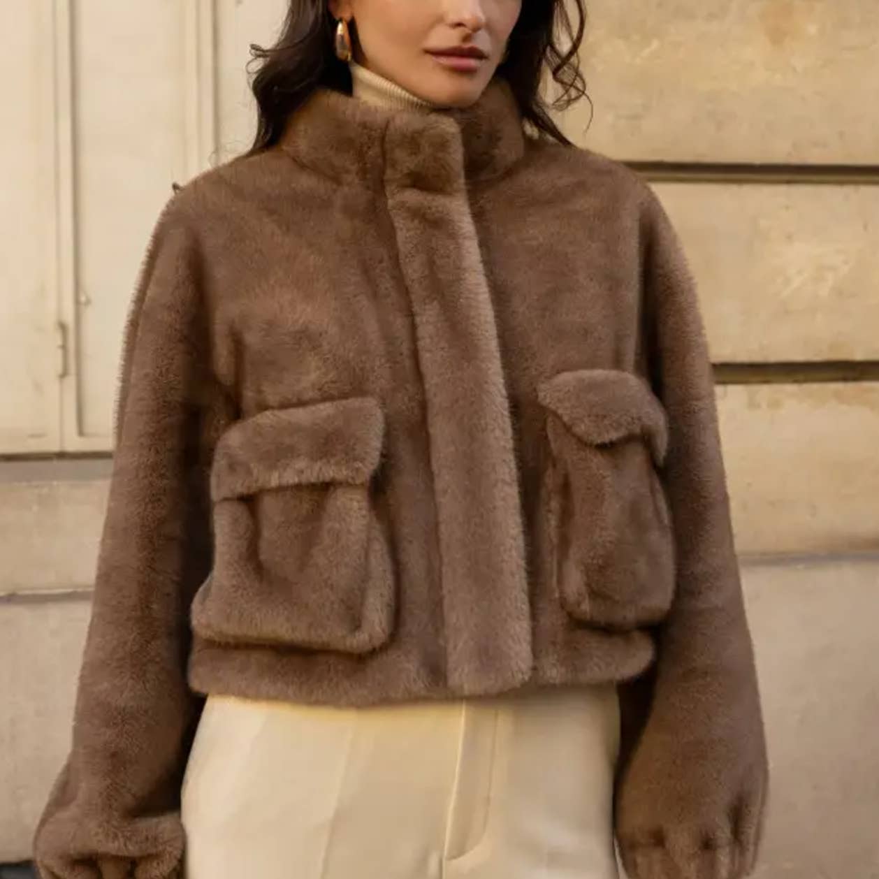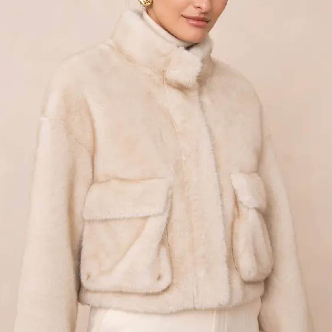 Beige soft faux fur zip-up coat. Large hood for a cocooning style. Straight cut with slightly puffed sleeves. Subtle braided detail on the sides. Integrated side pockets. Cozy and refined look for winter. • Sold in a pack of 3 pieces: Sx1 Mx1 Lx1