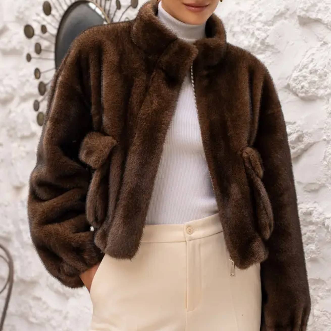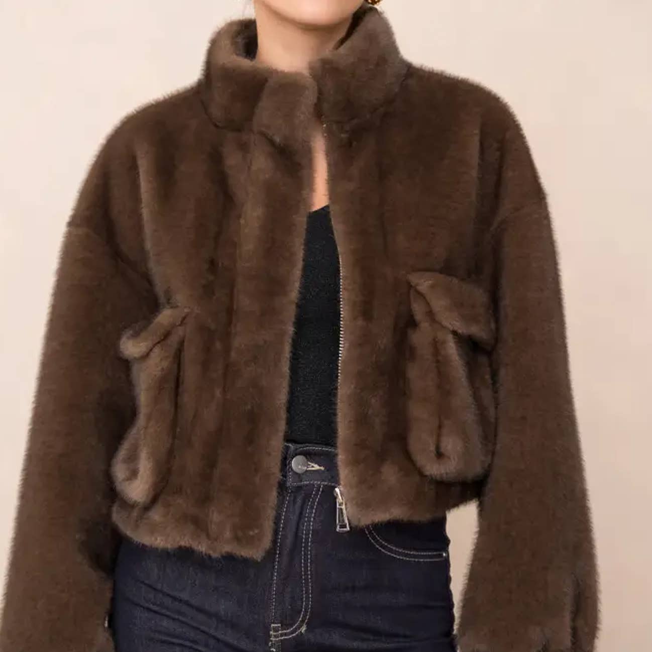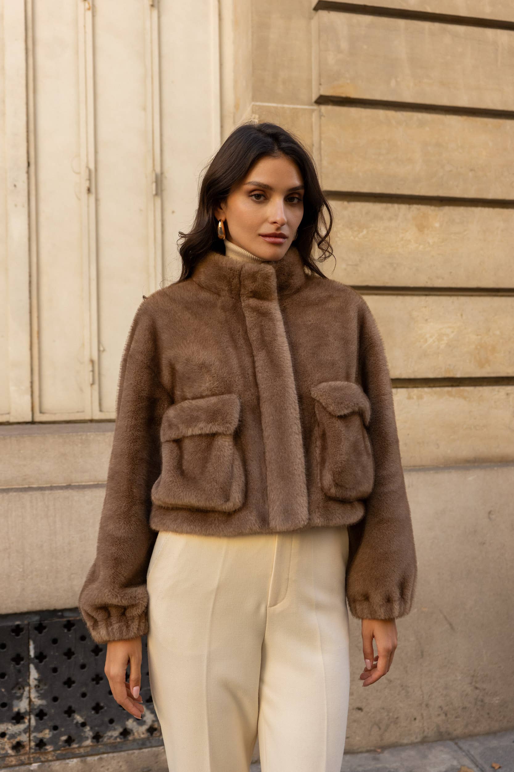 Faux fur coat with stand-up collar and snap closure