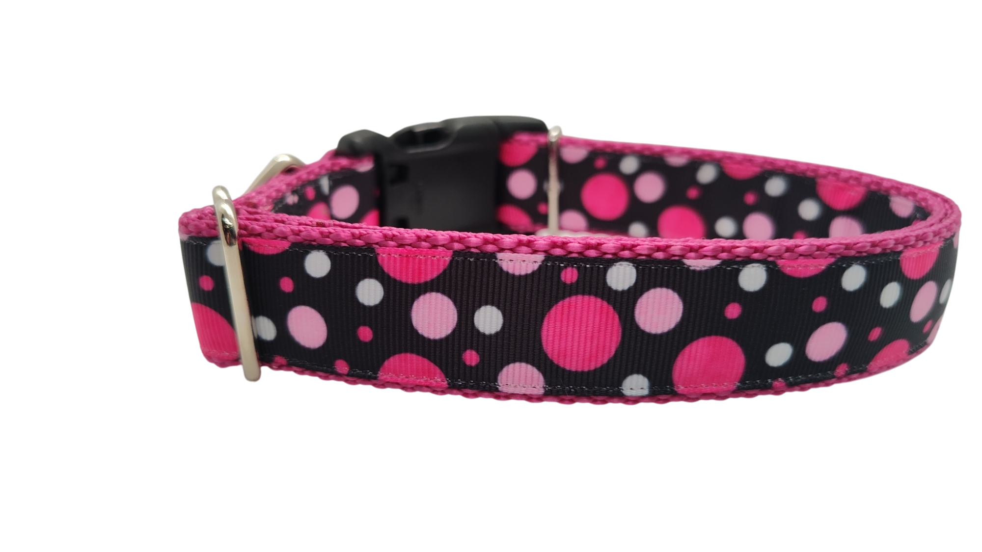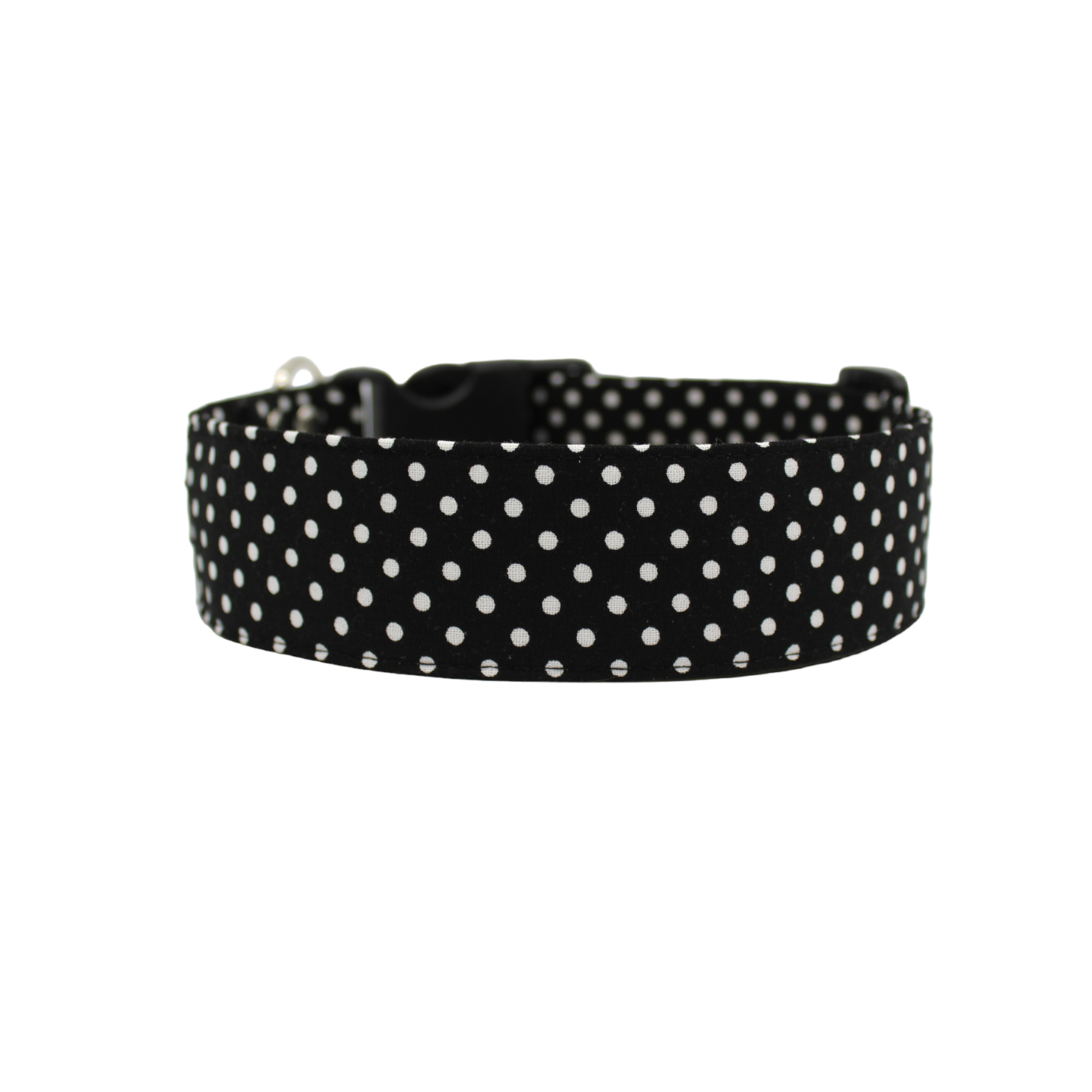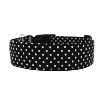 The Ebony Dot dog collar is a sophisticated and fun combination of jet black fabric with white polka dots dancing across the collar. This dog collar is the perfect fit for any stylish, trendy pup. These collars are made with designer fabrics and your choice of either a traditional black plastic buckle or our signature SP metal buckle. The nylon webbing core has a tensile strength of 2100 lbs., so they can withstand pulling by even the strongest of dogs. Our collars are machine washable.