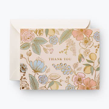 Exterior greeting "Thank You". Available packaged individually in an acetate sleeve with a gold envelope, or packaged in a box of 6 cards and envelopes. Select packaging option from the "Size" drop-down menu. Foil stamped and embossed greeting card. Printed on 105 lbs cover weight, teal stock. Dimensions standard A2 size card 4 1/4" x 5 1/2". Made in our SF Bay Area studio.