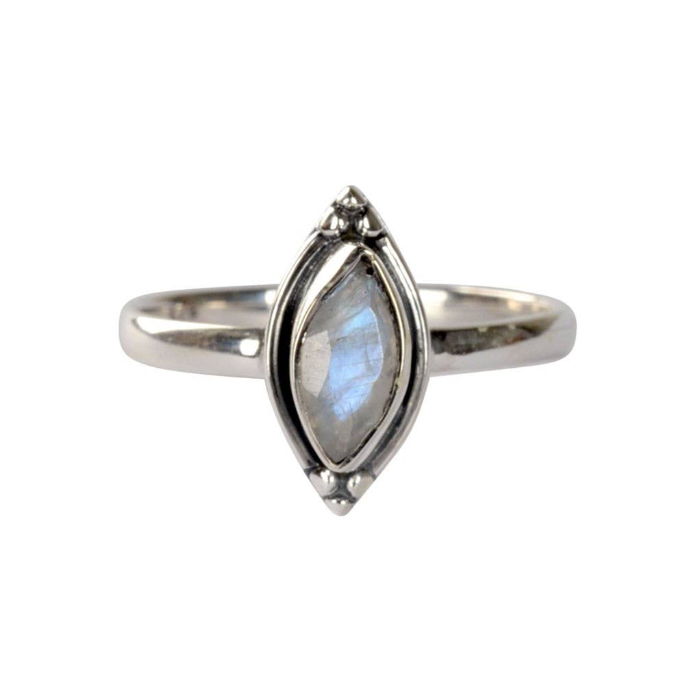 This delicate and lovely little ring is perfect to dress up for a night out, or to wear every day! A little teardrop of natural rainbow Moonstone is nestled in a bezel surrounded by a crown of beads. It gives the appearance of two stacked rings, but it is actually one piece. Available in silver tone or gold tone! Ring size: Adjustable (please do so very gently) Materials: Plated brass, rainbow Moonstone Stone size: Pear shaped 1/8" x 1/4" / 4mm x 6mm Please remember - this piece is created with a natural stone, each different from the next. This means that your piece will vary in appearance from what is pictured, and will be beautiful and unique. These are individually handcrafted and the particular piece you receive may vary slightly from what is pictured. These are also not 100% waterproof, so please avoid getting this wet. Our jewelry makes a great gift or stocking stuffer!