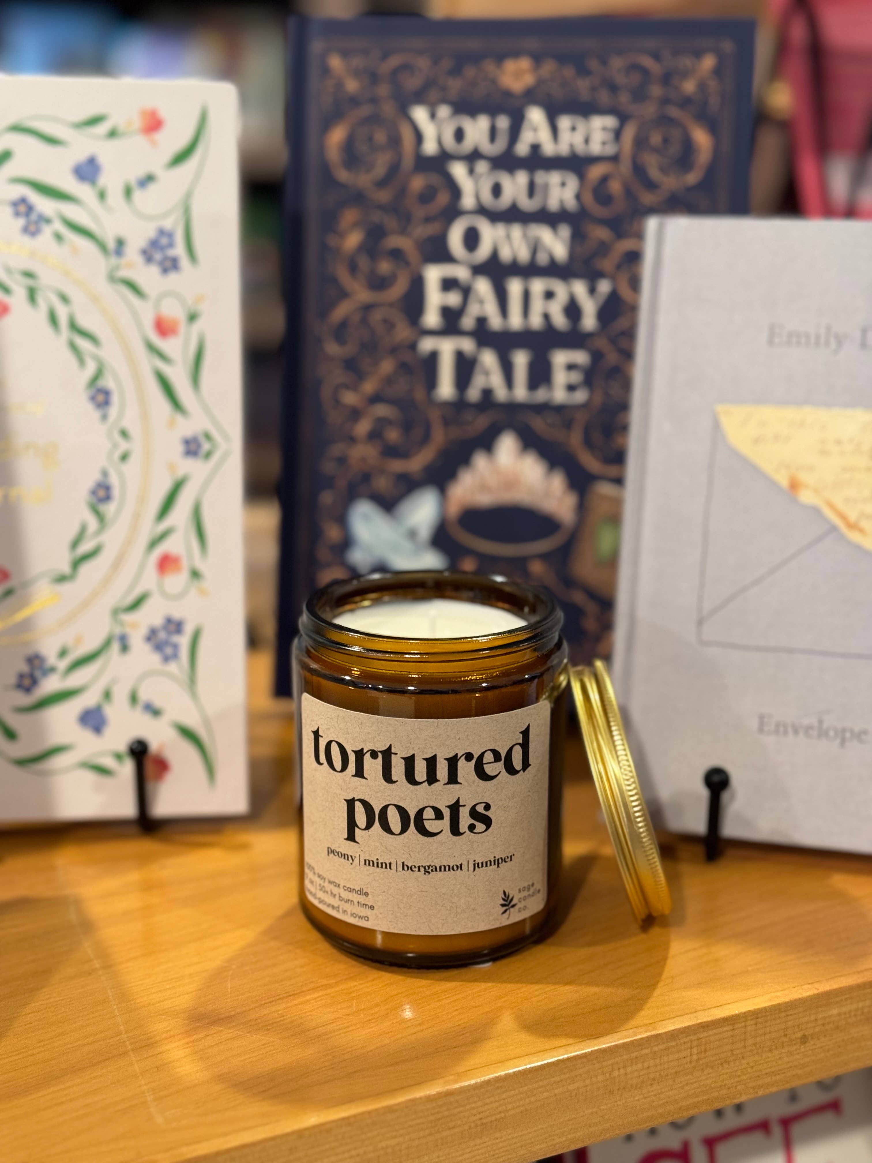 Tortured Poets - 100% Soy Wax Candle This natural candle is hand poured in small batches and comes in an amber glass jar measuring at 3.5 inches in height and 2.75 inches in diameter (9 oz jar) with a cotton wick. The candle is non-toxic, and the ingredients consist of 100% soy wax and natural fragrance oils. The oils are 100% phthalate-free and is also free from carcinogens, toxins, and other hazardous chemicals. Fragrance notes: peony, mint, bergamot, juniper Burn time: 50+ hours