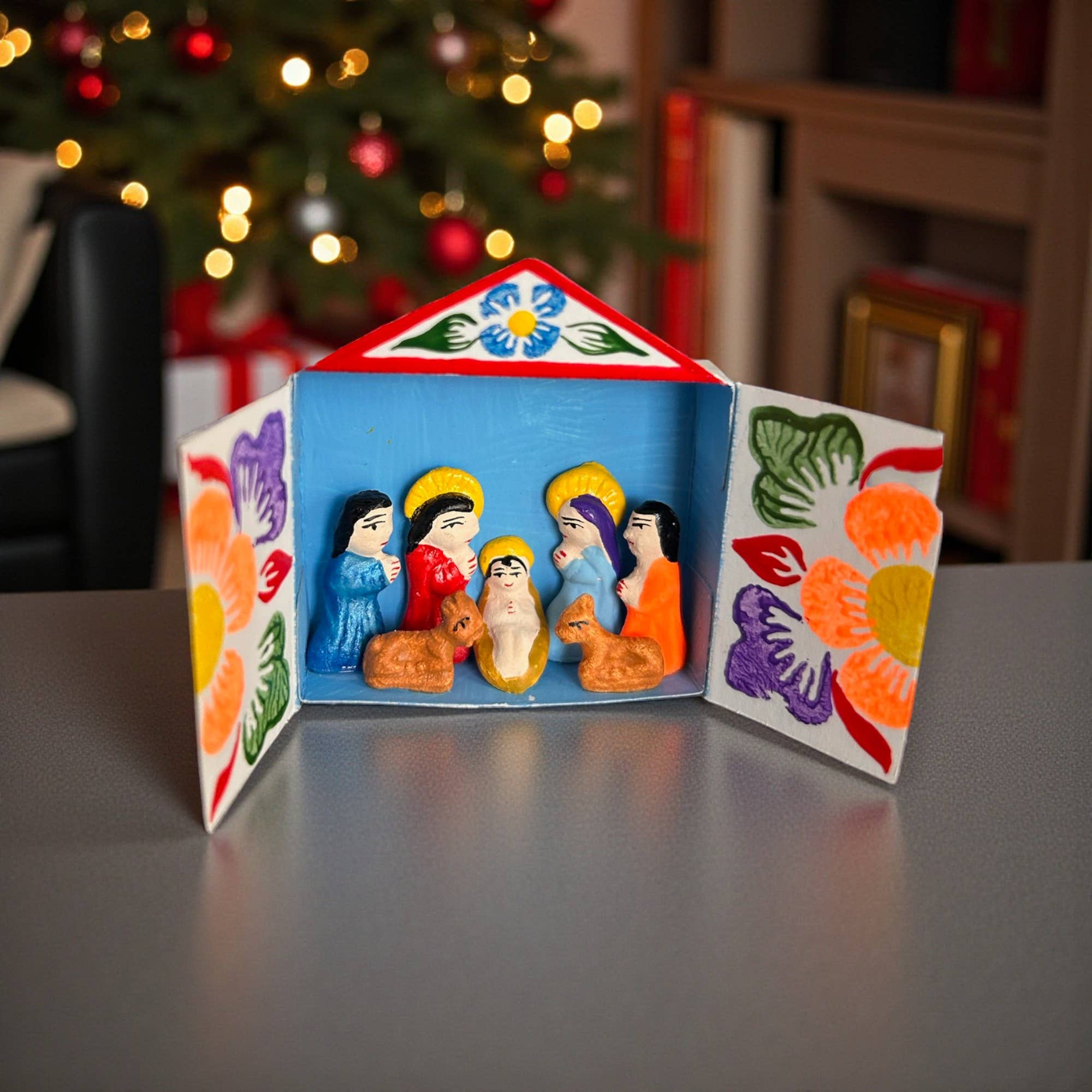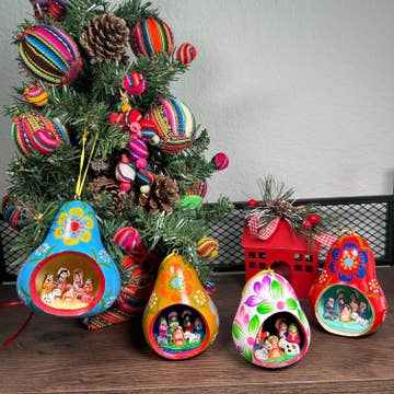 Elevate your Christmas Tree Decoration with our beautiful Christmas ornaments of gourds with the nativity scene - ready to hang. These ornaments are handmade in a gourd shape, with flower drawings outside, and inside the Holy Family nativity scene. It brings a touch of the Peruvian Andean culture into your Christmas celebrations. It comes in different colors You will receive assorted colors. Dimensions: Each gourd measures 3” x3” approx As they are handmade, expect minimal variations, some are more round and others more gourd-sized.