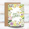 Celebrate birthdays with the timeless elegance of watercolor florals. This charming 5x7" greeting card features a vibrant blue delphinium stem surrounded by whimsical garden visitors—a butterfly, dragonfly, and ladybug. Size: 5x7 inches Envelope: Includes a coordinating kraft envelope Material: High quality cardstock with a smooth matte finish Blank Inside: Plenty of space for a personal message Packaging: Clear protective sleeve for retail display Designed and printed in the USA. Ideal for boutiques, gift shops, and stationery lovers.