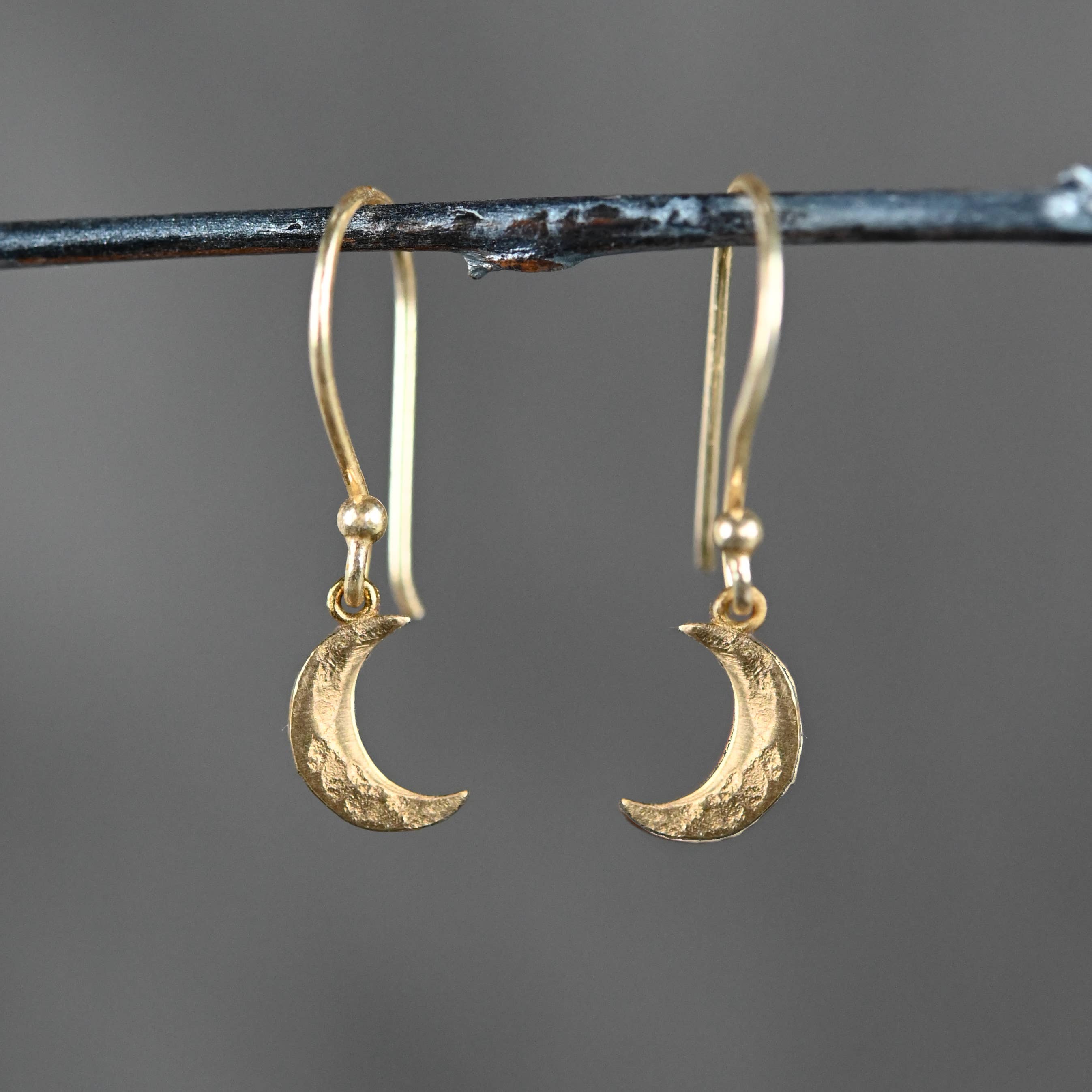 Hand hammered, cut and filed brass crescent shapes (traditional "squash blossom" shape) with handmade sterling silver ear wires. Materials: Brass, sterling silver. Size: Approximately 2 1/2" in length and 2" across at widest point.