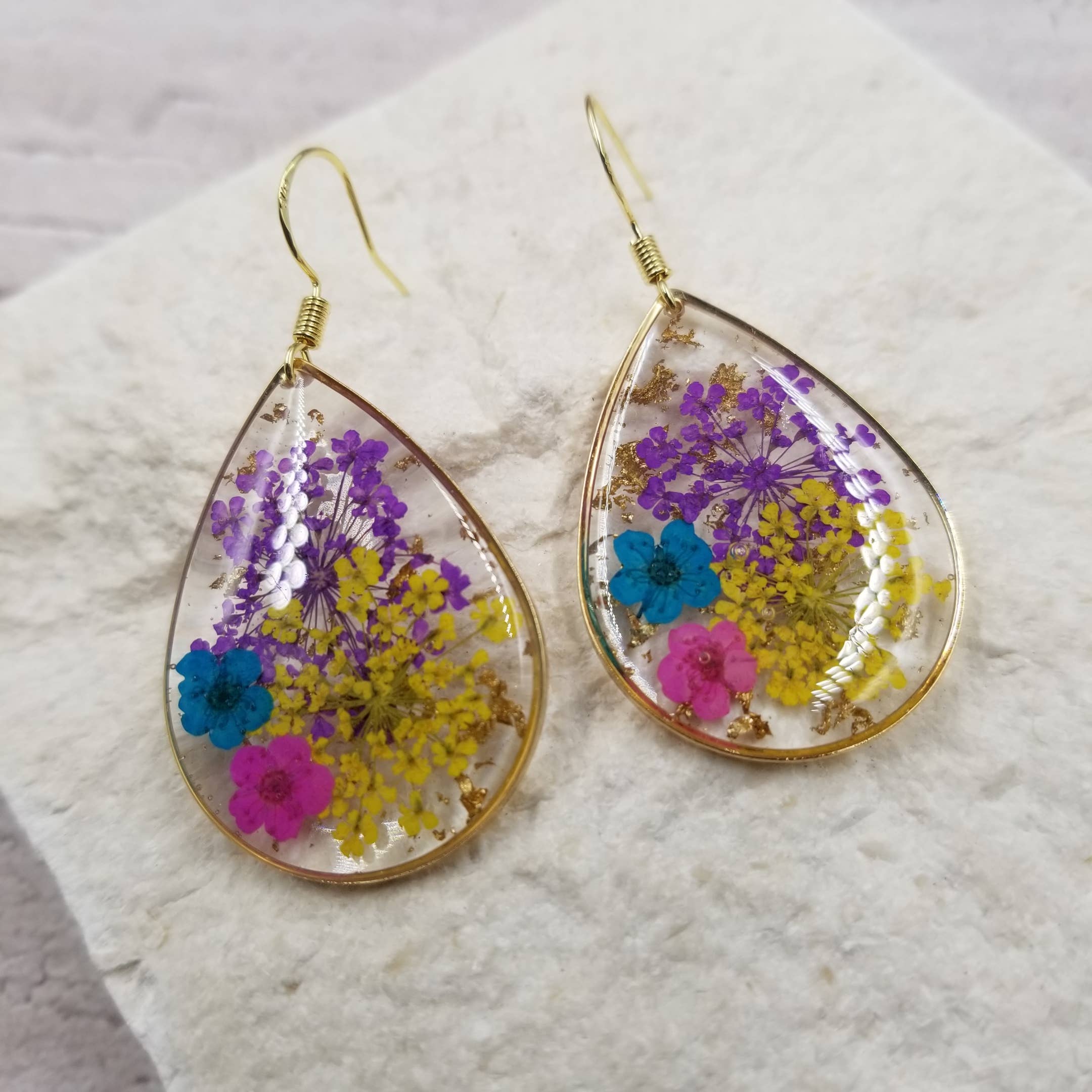 Each earring features a real flower, preserved in crystal clear resin to capture its delicate beauty forever. Lightweight and hypoallergenic, perfect for nature lovers and gift boutiques alike. Packaged and ready for retail display. Size: 1.8 inch