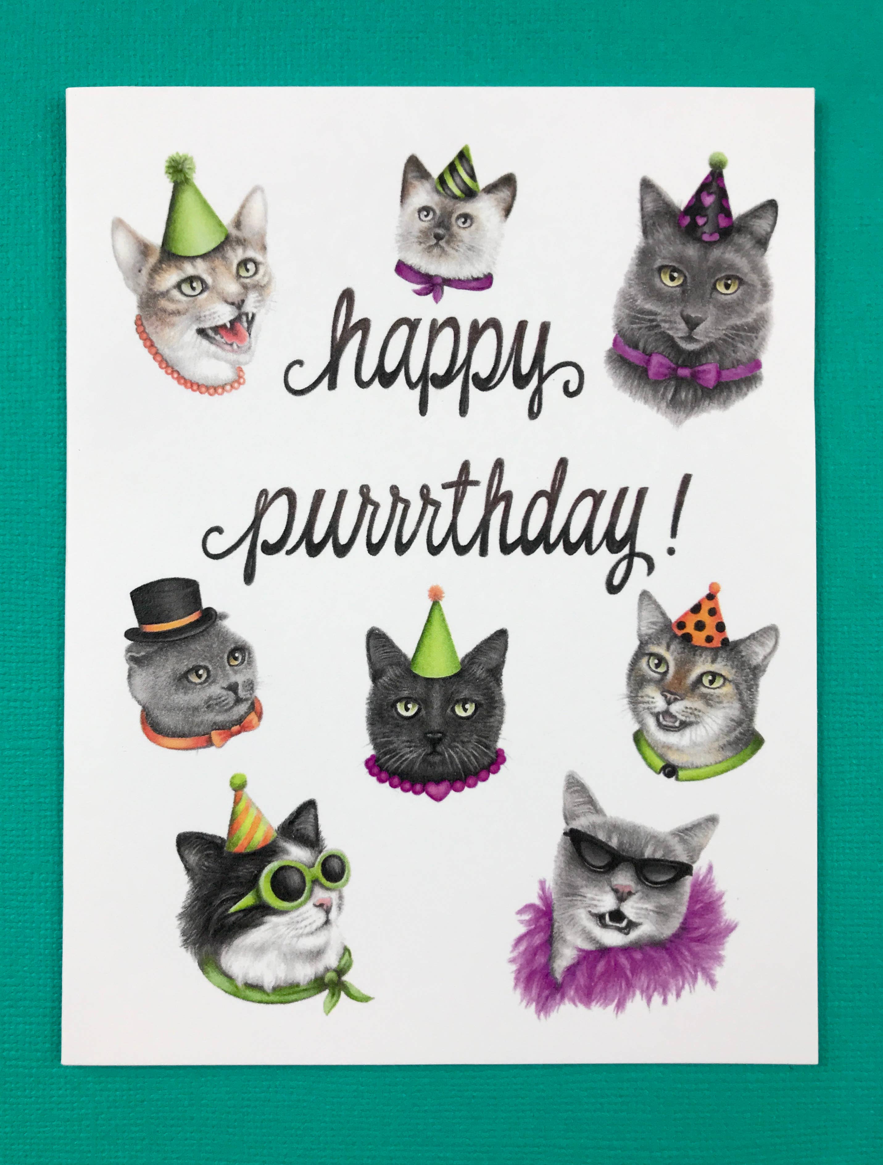 Three happy cats on this colorful birthday card. Hand-painted touches of sparkling glitter have been added to accent the birthday greeting card. "Happy Birthday" is printed on the front of the 5" x 7" card. This card is made in the USA with environmentally-friendly materials. It comes pre-packaged with a white envelope, which requires standard postage to send. The inside is blank, leaving room for a custom message or photograph.