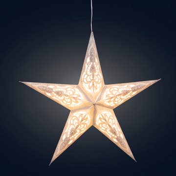 Our star lights are handcrafted in India by partners of the om gallery. They are available in many dazzling patterns. Made with 100% recycled materials, these hanging lanterns create ambiance and a clever accent lighting. "create your om". Dimensions: 24" x 24" x 8". Lighting Kit is Included. Available in black or white. Please indicate in the comments your cord color.