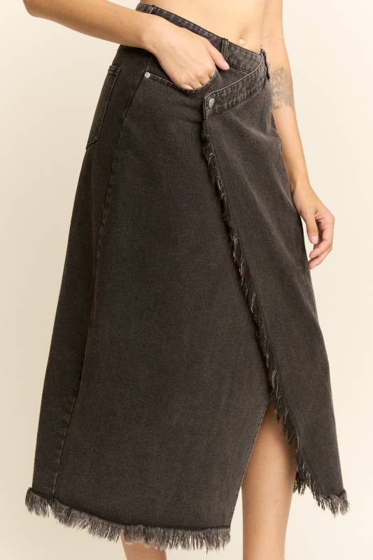 ***SET WITH JACKET T2819*** - Frayed midi skirt w/ center slit - Fitted size - Zipper closure - Front pockets on skirt - Good stretch - Model size 5' 9" ( Wearing S size) - Keywords: fall clothing, fall 2024