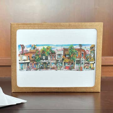 The vibrant and detailed art on these notecards was created by a pen-and-ink and watercolor artist (and UNC grad!) based in Durham, North Carolina, and captures why every day is a good day to be a Tar Heel! The artwork features classic UNC Chapel Hill landmarks, like the Old Well, Wilson Library, and the Davie Poplar, along with favorites of college students and townies alike, like The Baxter, Merritt's Grill, Linda's, Sutton's Drug Store, and Julian's. THE DETAILS • This box includes five 5x7" greeting cards and five white self-seal cotton envelopes • Cards are blank inside with the town name printed on the back • Cards are packaged in a kraft box with clear window and a colorful descriptive label on the back • As a bonus, cards can also be framed, so they double as a mini print for the purchaser or recipient!