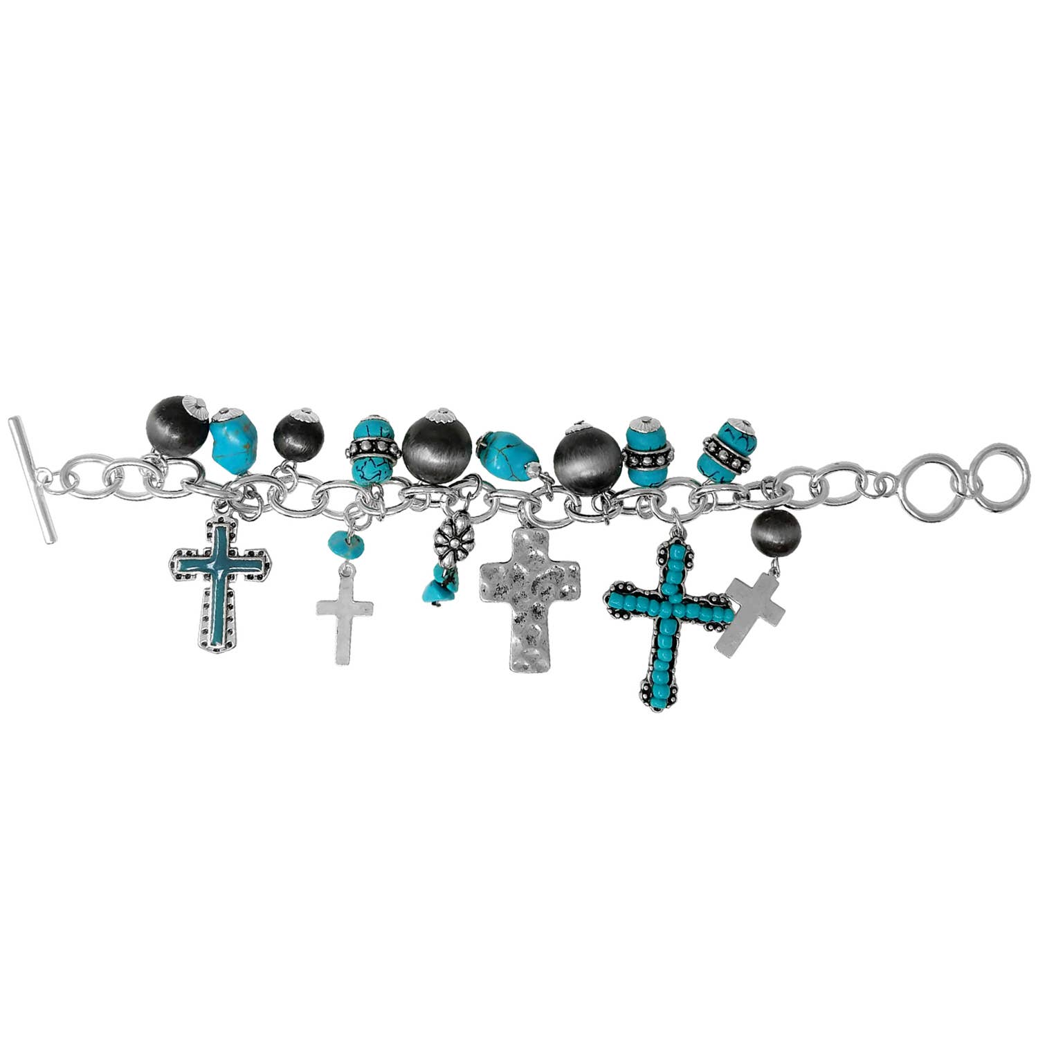 Western stretch silver bracelet made of individual unique pieces. Faith, cross, hope, love, heart symbols and design. Beautifully crafted and designed. Stretch to fit most wrists. Weights 1 ounce. Lead and nickel compliant. Only from Lunar Deer.