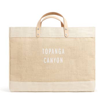 Tan/natural canvas bag, 15”H x 15”W x 5”D with 11” drop for the dark brown handles Open main compartment with small zippered inner flap pocket See main image for design. Image on bag is for visualization only, not actual image/words